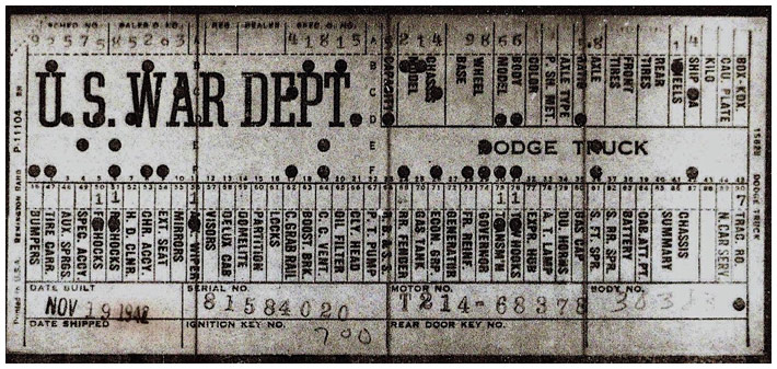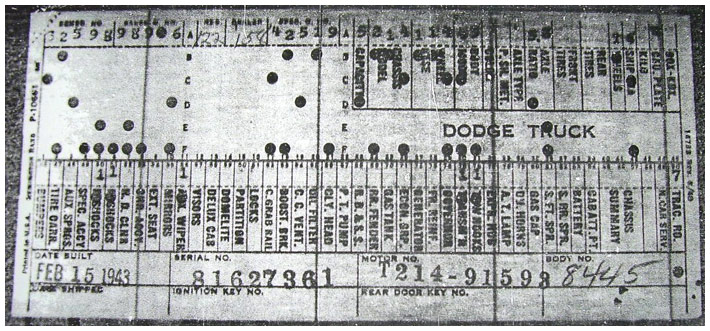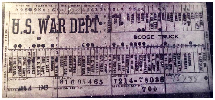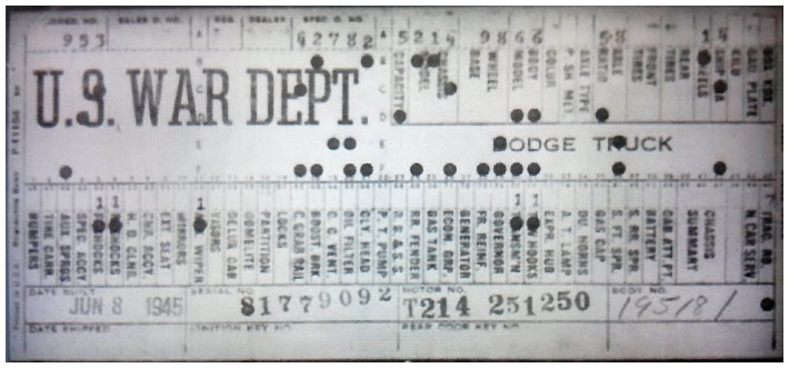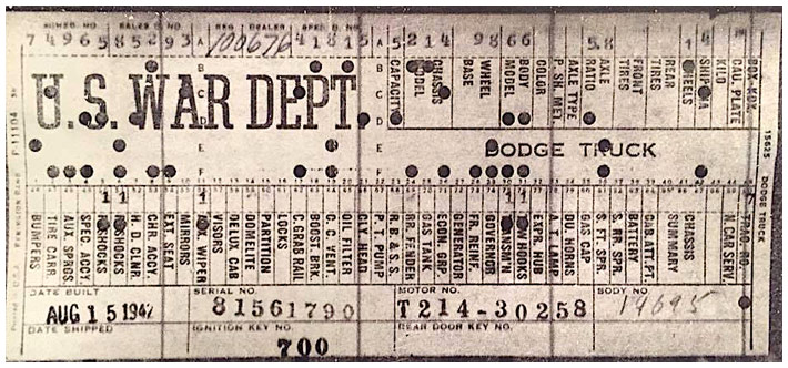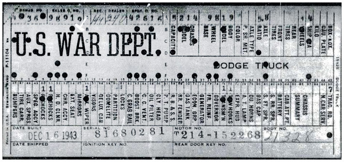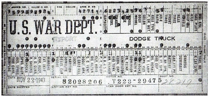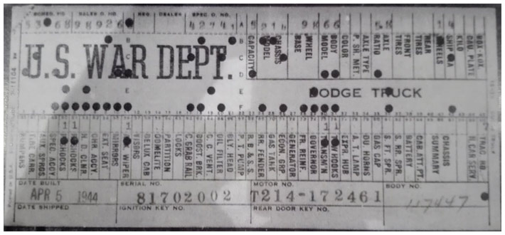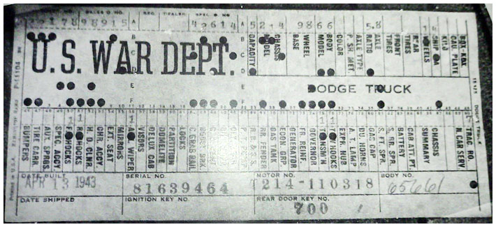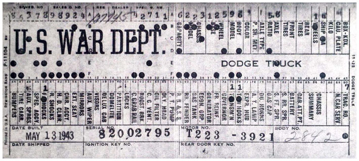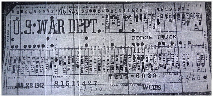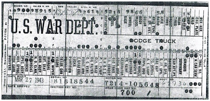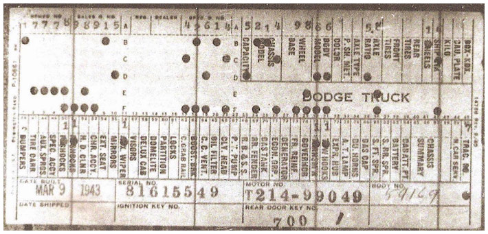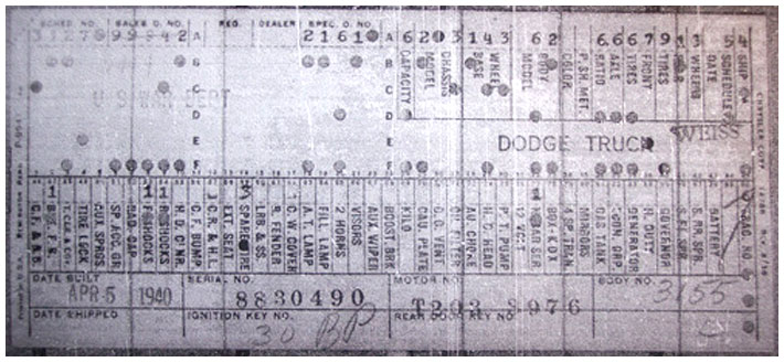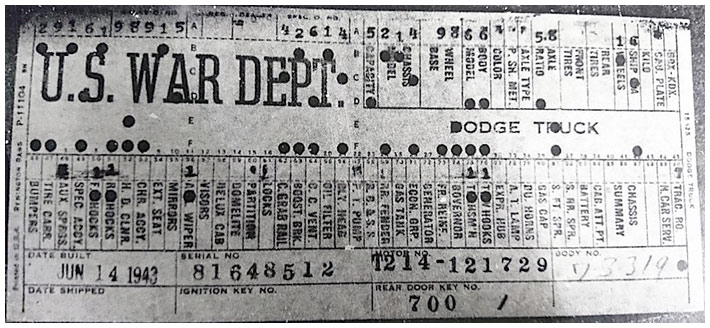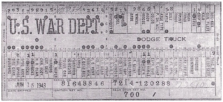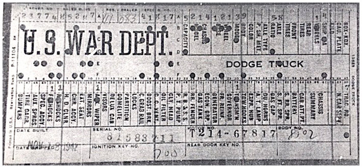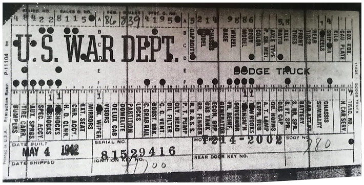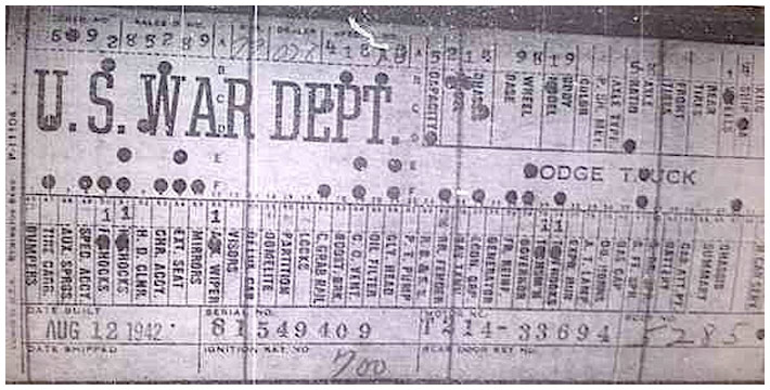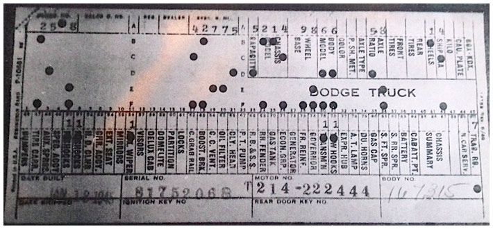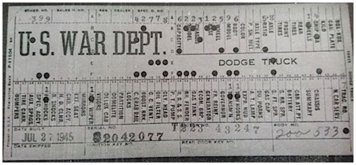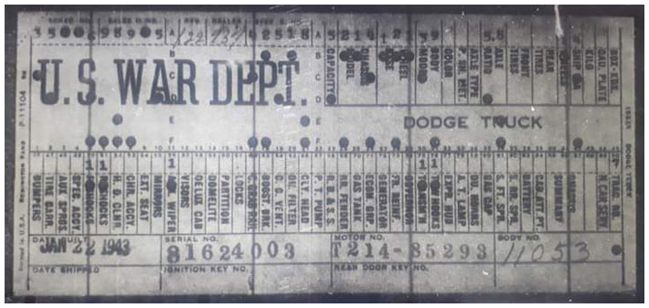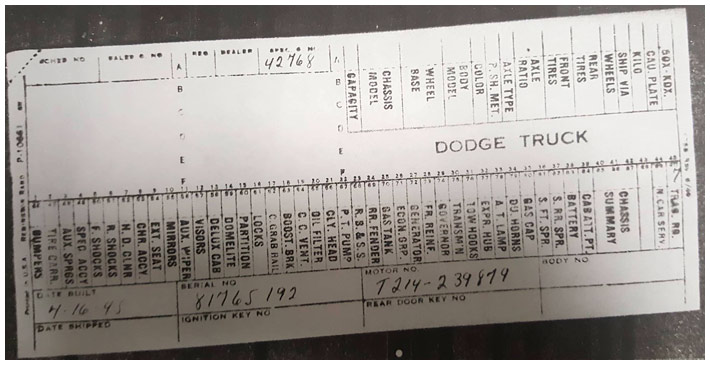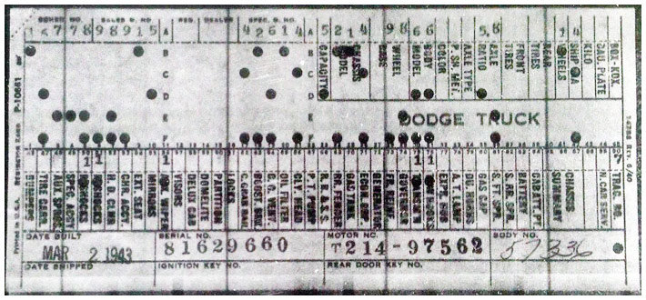 The first picture shows a scan of a build card as received from the Chrysler archives. The card shows the original model and exact body of the Dodge with that serial / VIN number, here VIN 81546650 built with body 933 on 25th of July 1942 as a body model 29.