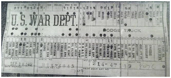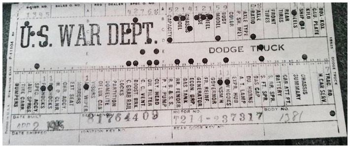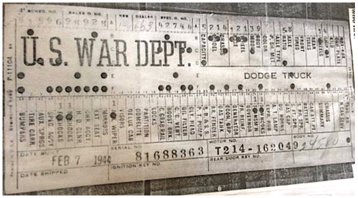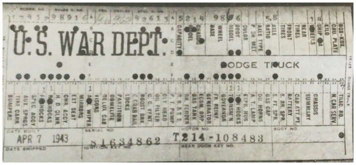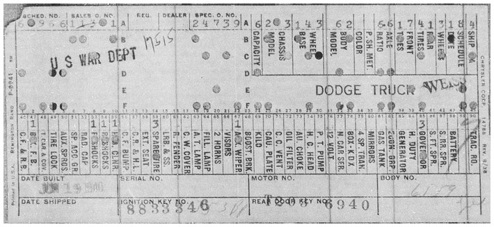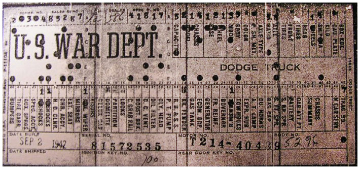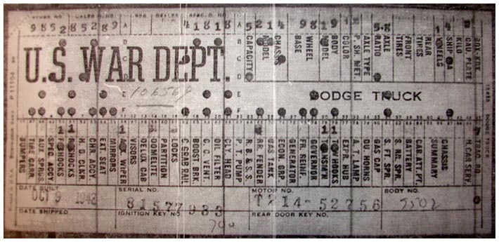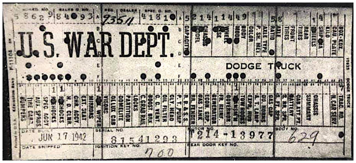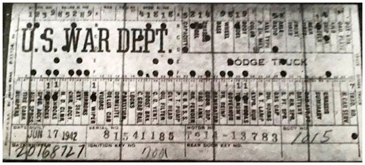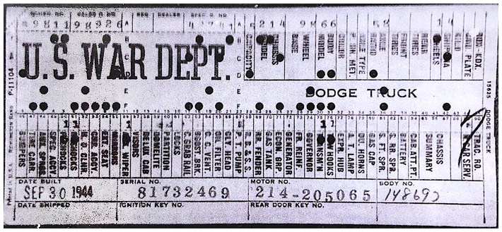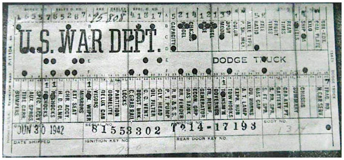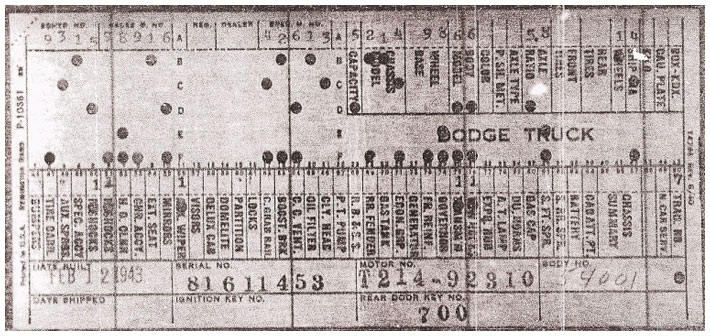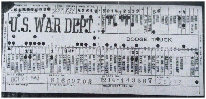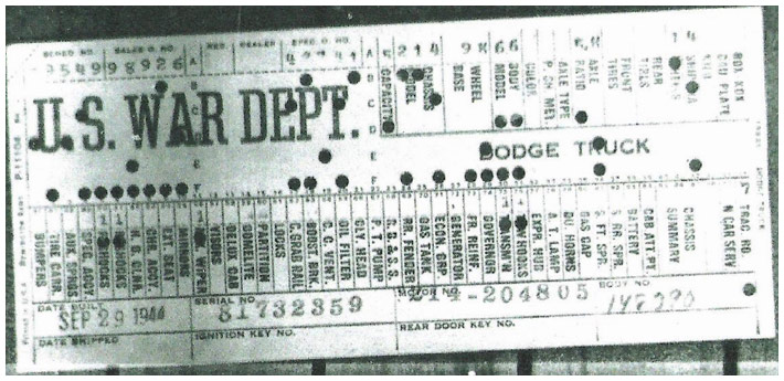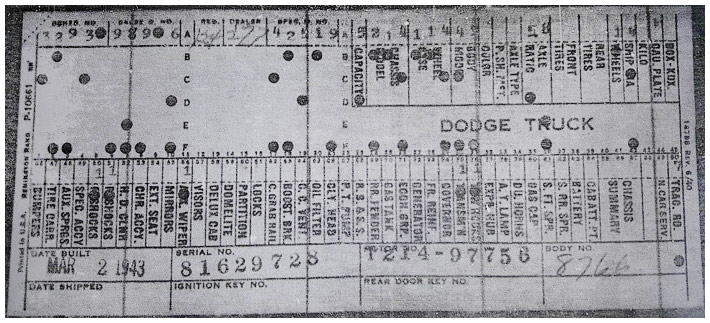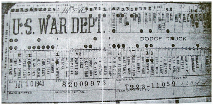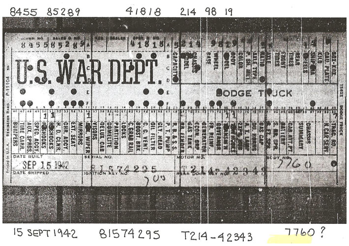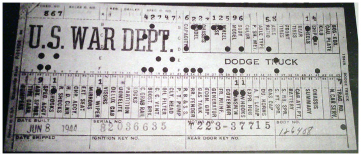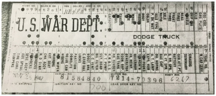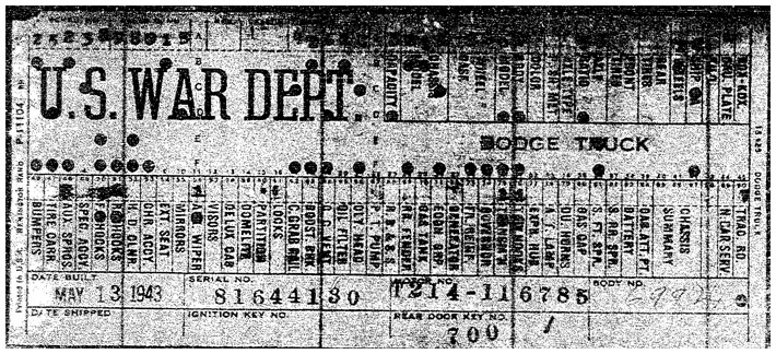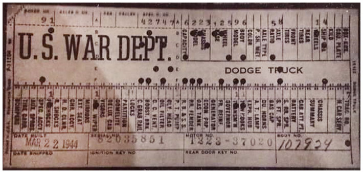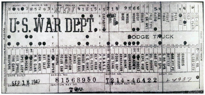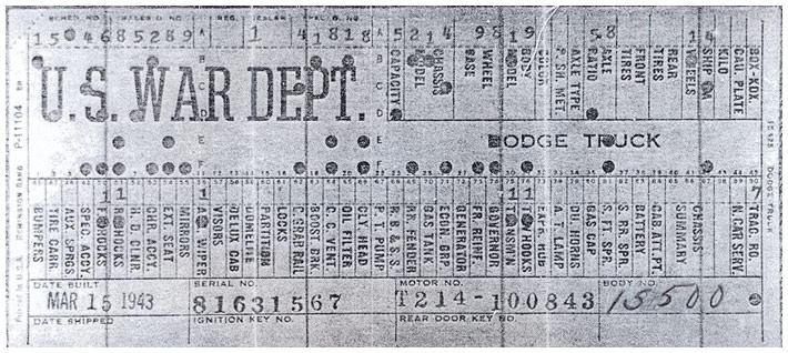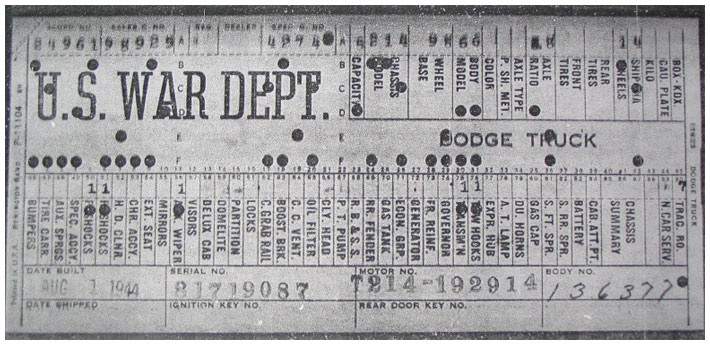 The first picture shows a scan of a build card as received from the Chrysler archives. The card shows the original model and exact body of the Dodge with that serial / VIN number, here VIN 81546650 built with body 933 on 25th of July 1942 as a body model 29.