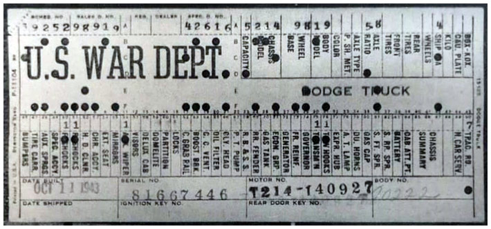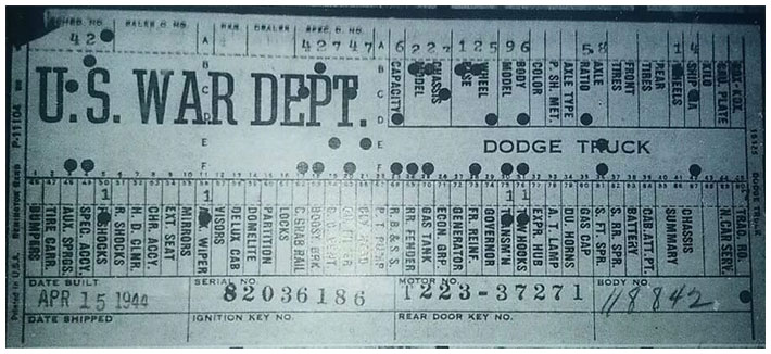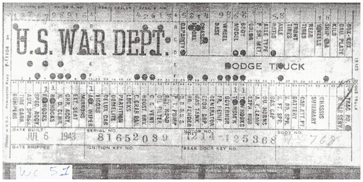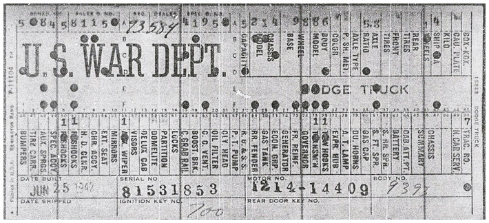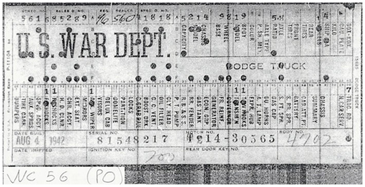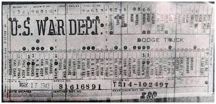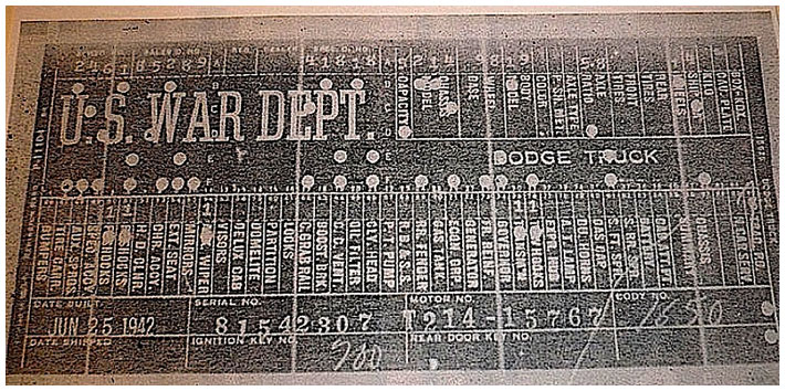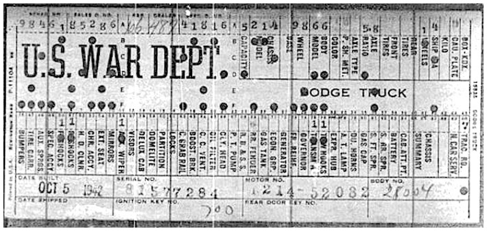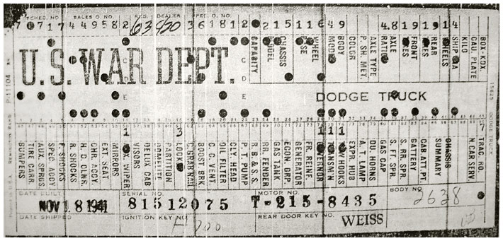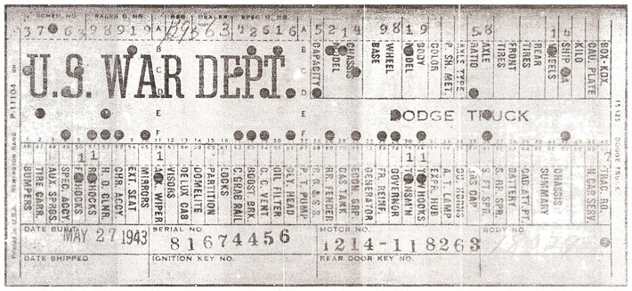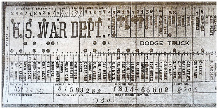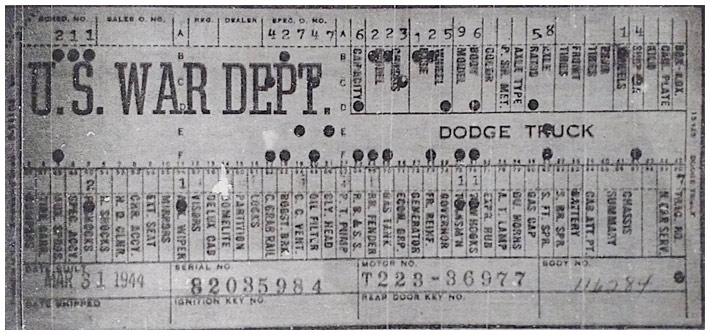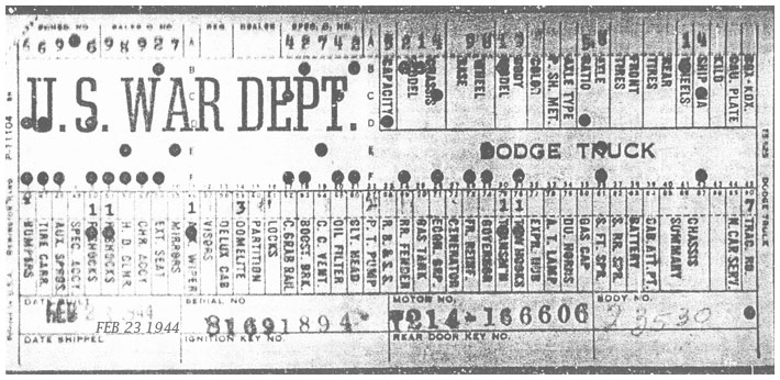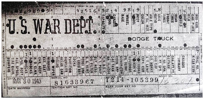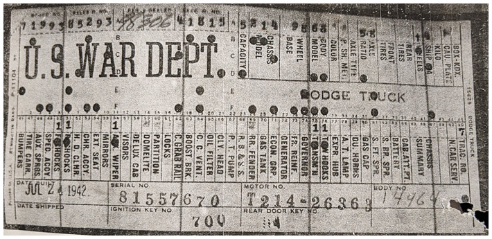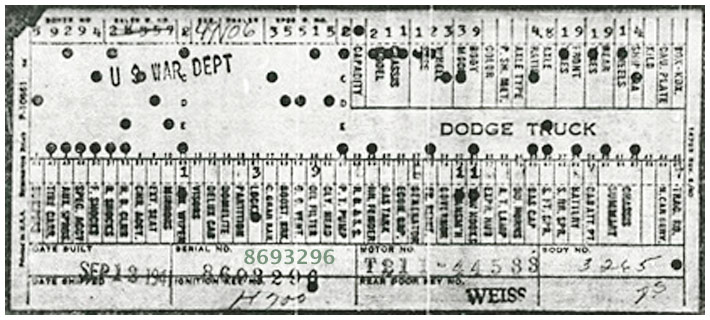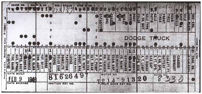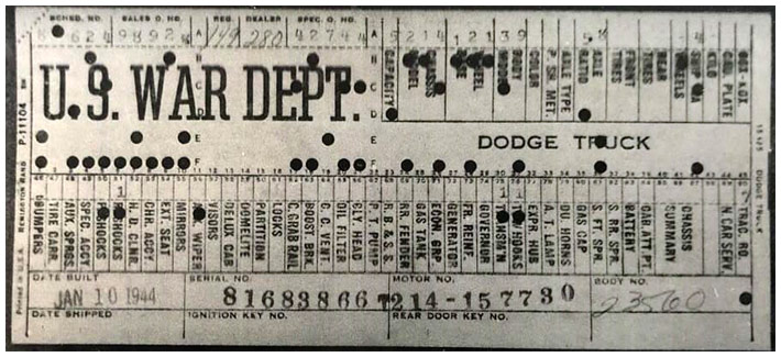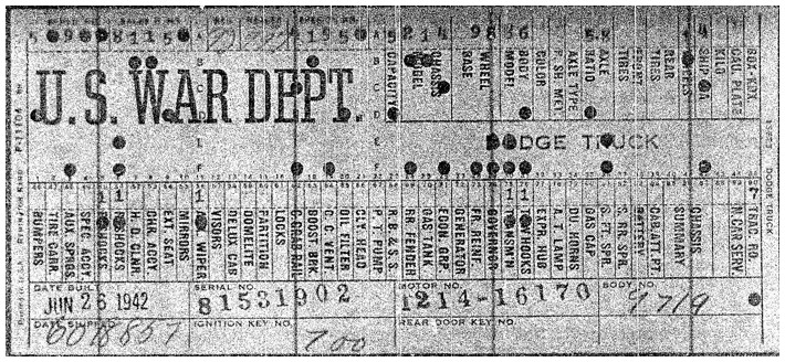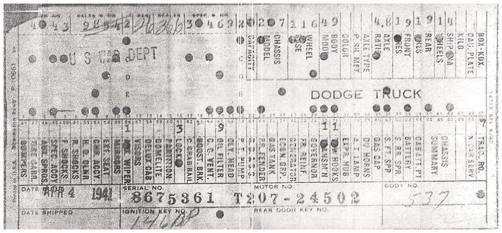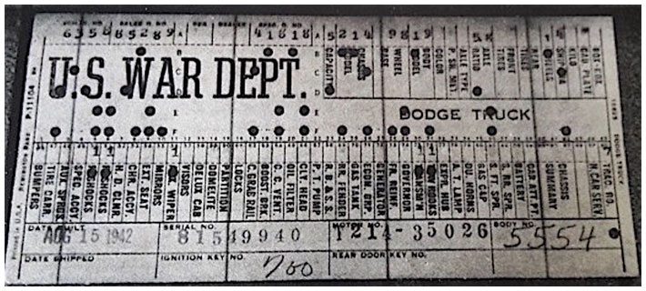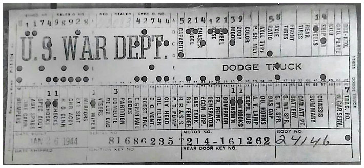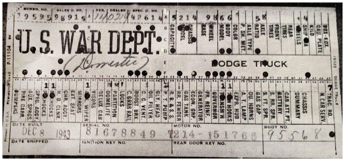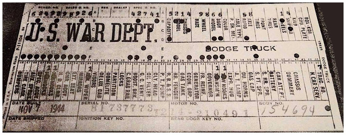 The first picture shows a scan of a build card as received from the Chrysler archives. The card shows the original model and exact body of the Dodge with that serial / VIN number, here VIN 81546650 built with body 933 on 25th of July 1942 as a body model 29.