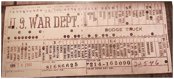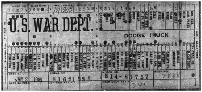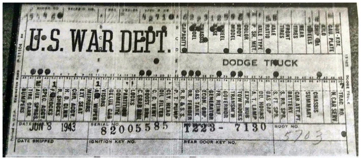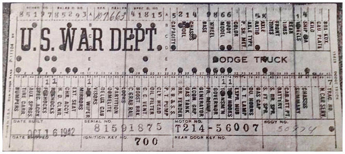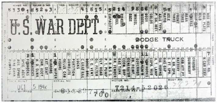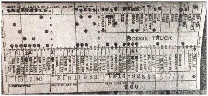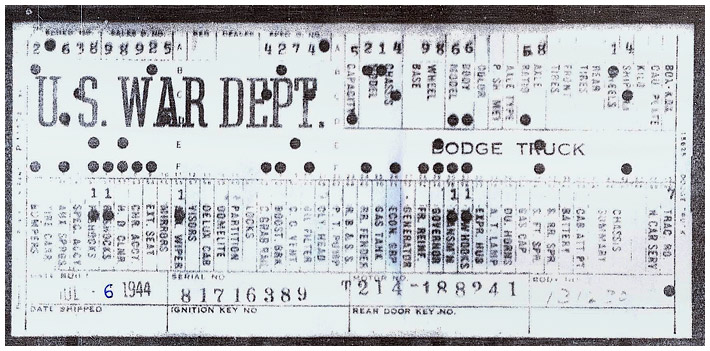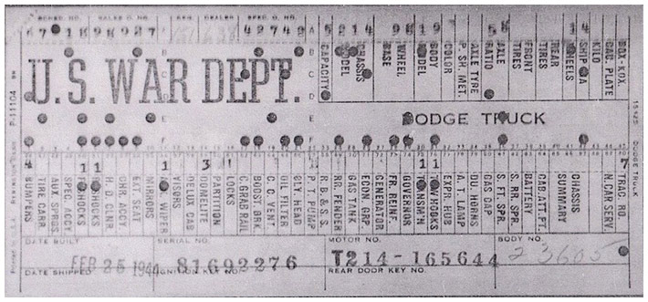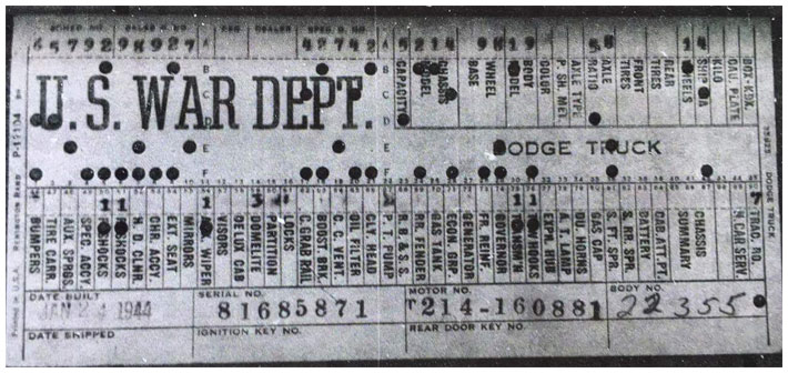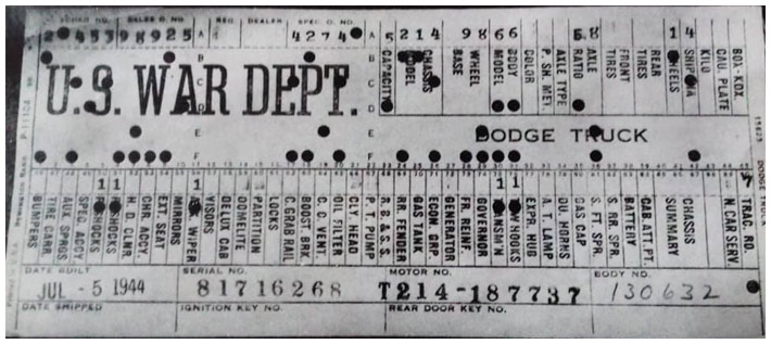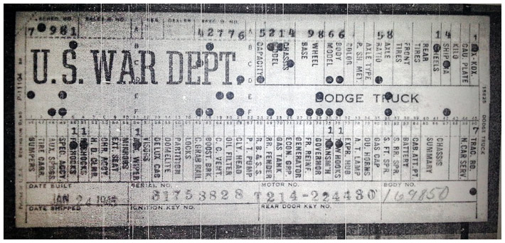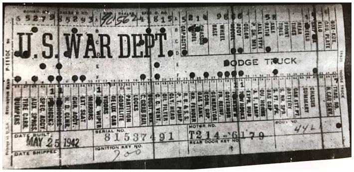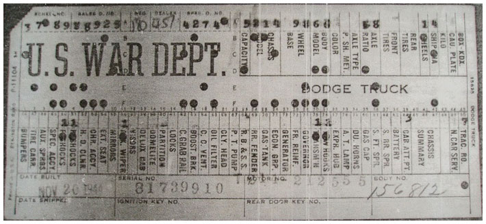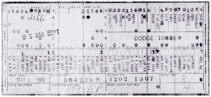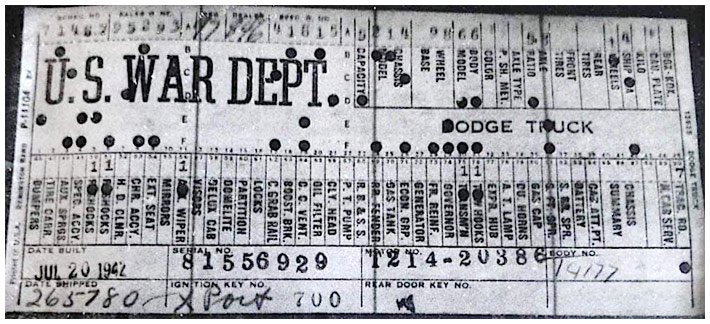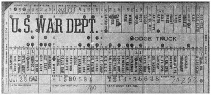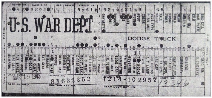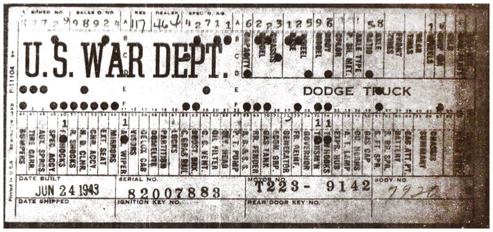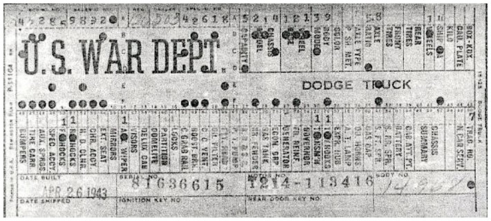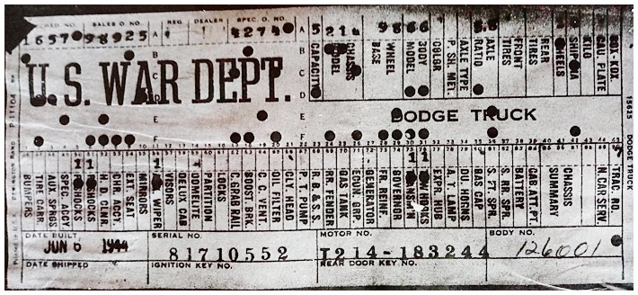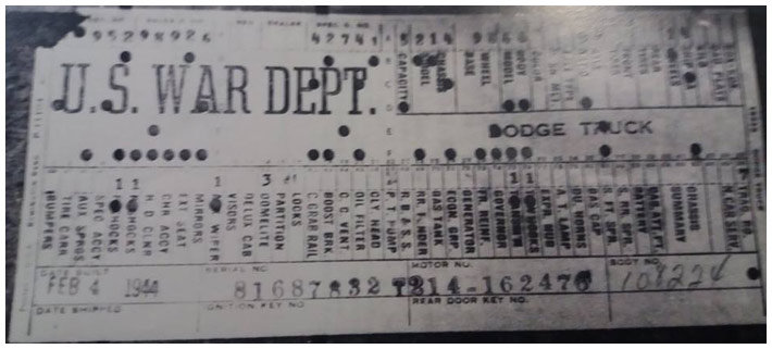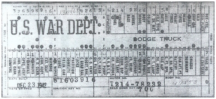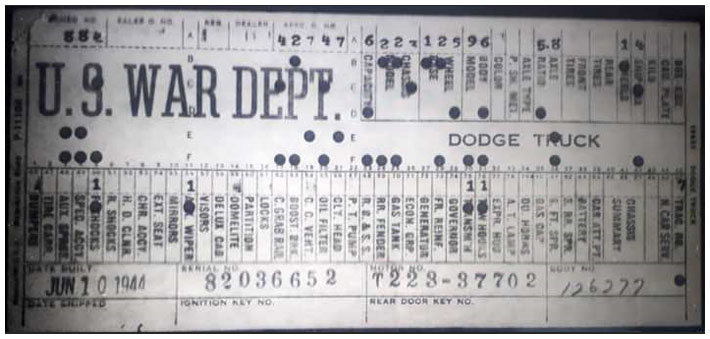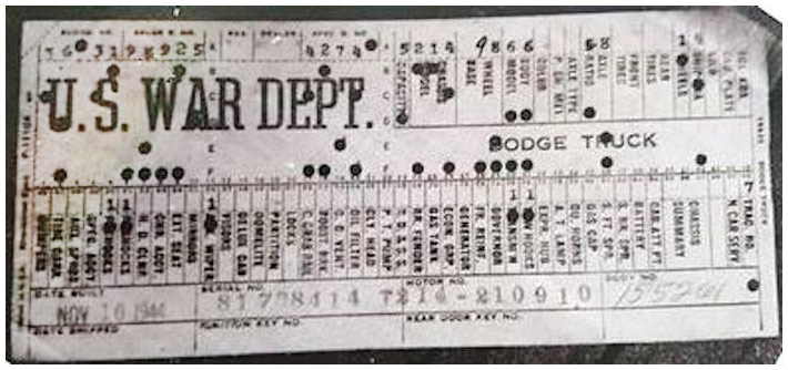 The first picture shows a scan of a build card as received from the Chrysler archives. The card shows the original model and exact body of the Dodge with that serial / VIN number, here VIN 81546650 built with body 933 on 25th of July 1942 as a body model 29.
