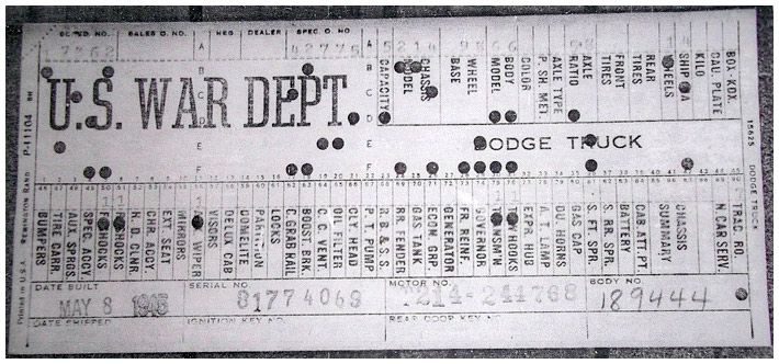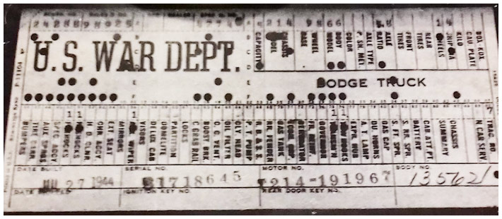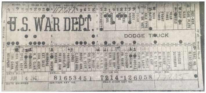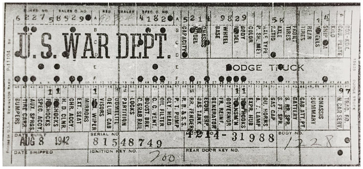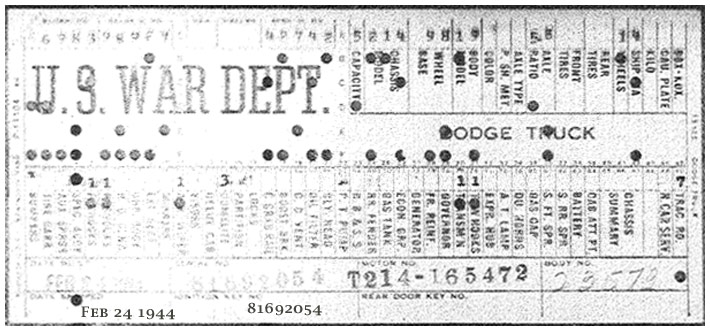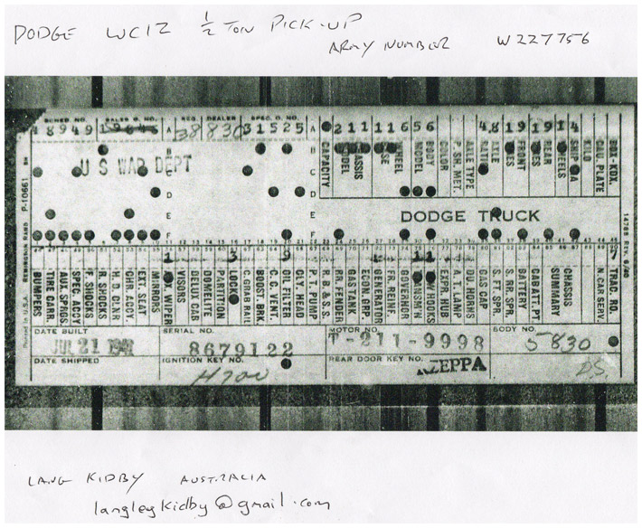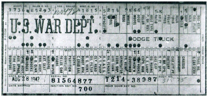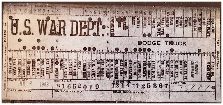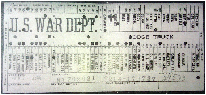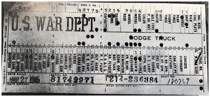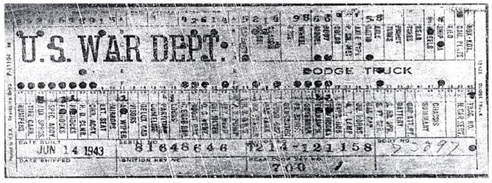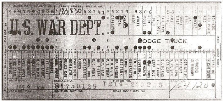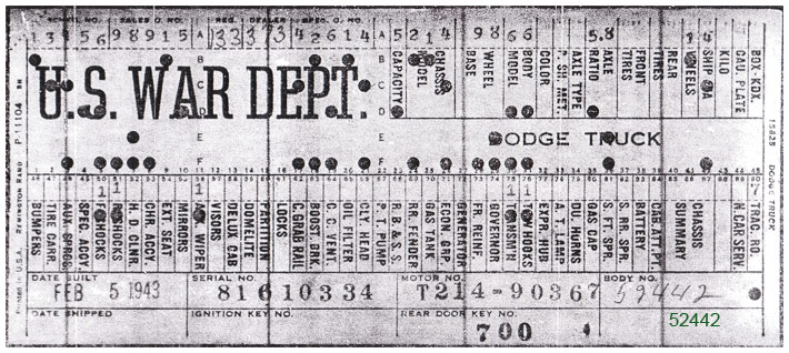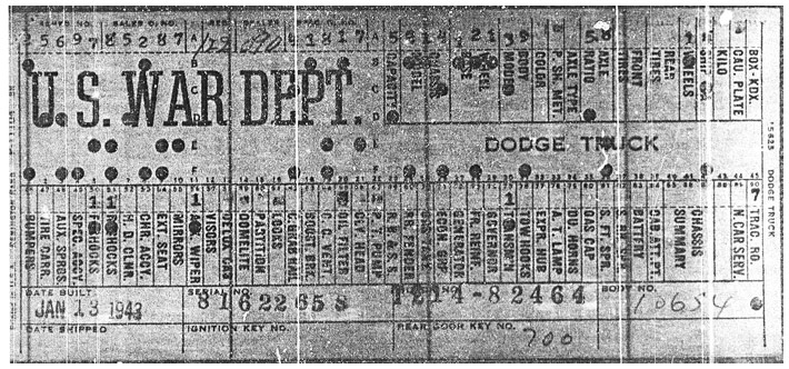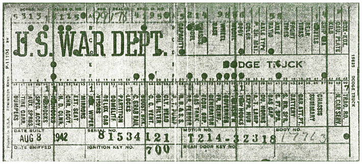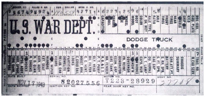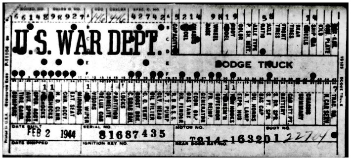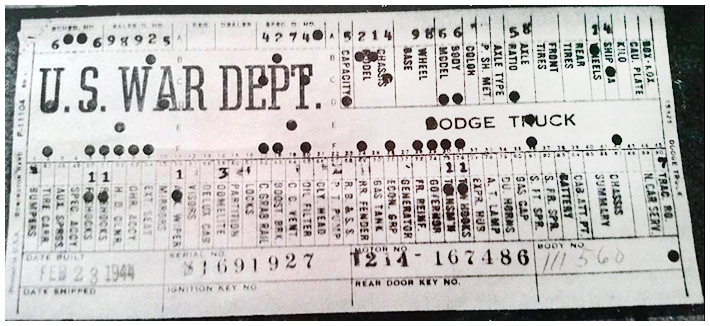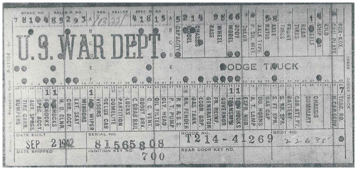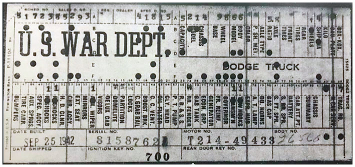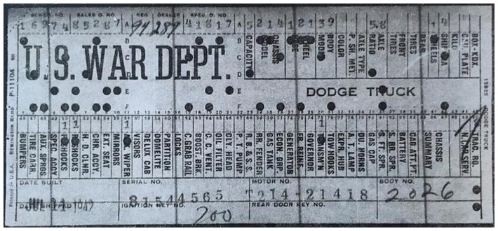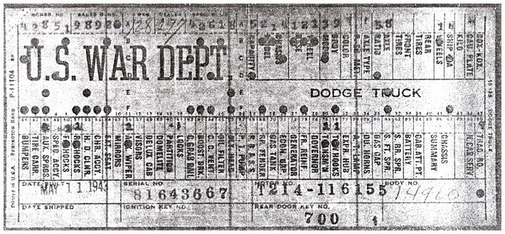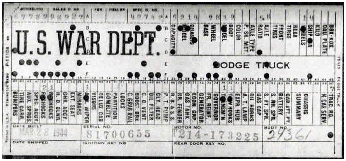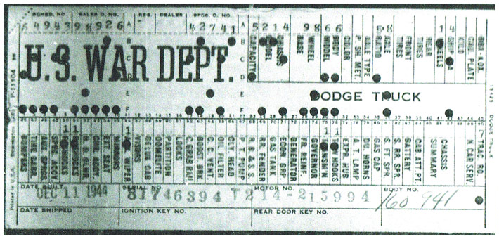 The first picture shows a scan of a build card as received from the Chrysler archives. The card shows the original model and exact body of the Dodge with that serial / VIN number, here VIN 81546650 built with body 933 on 25th of July 1942 as a body model 29.