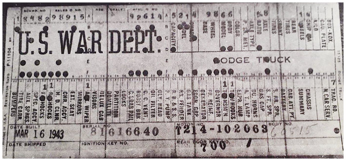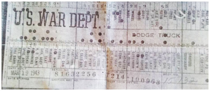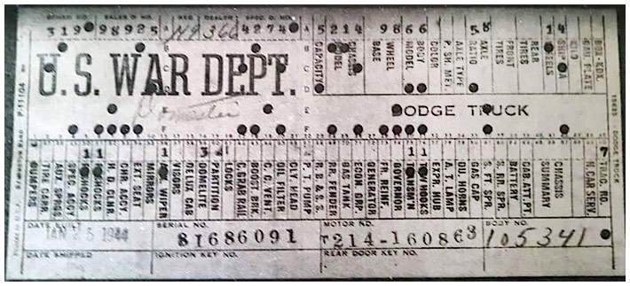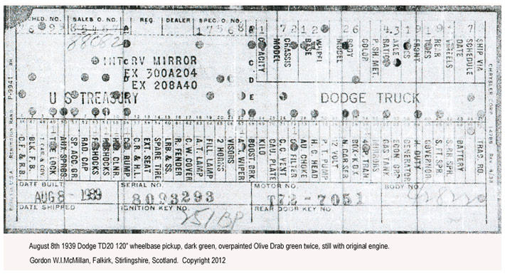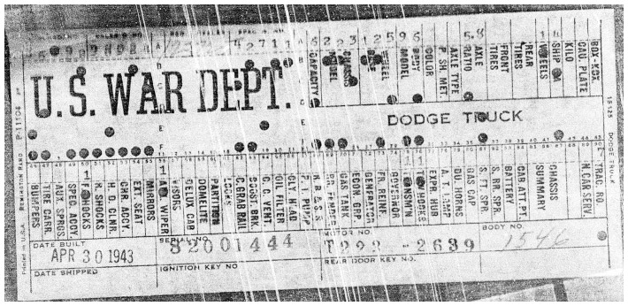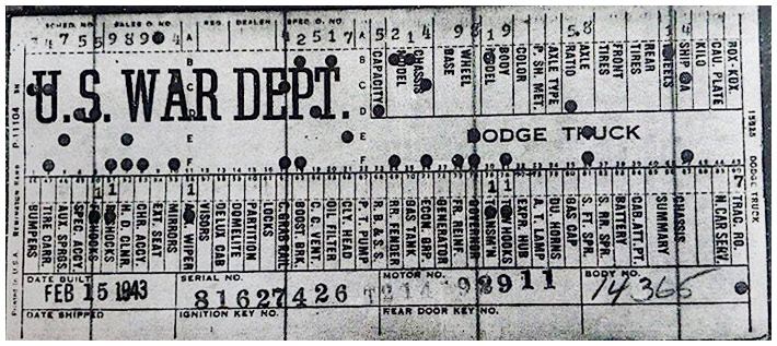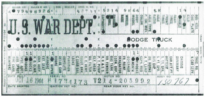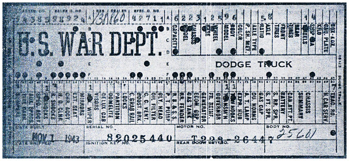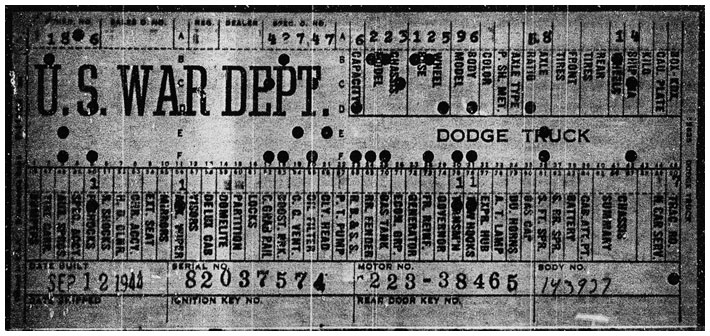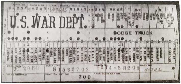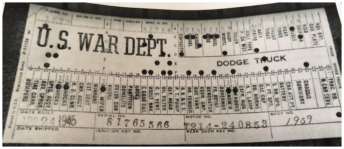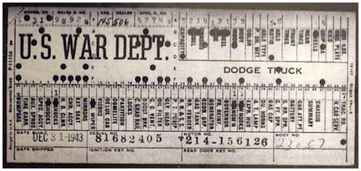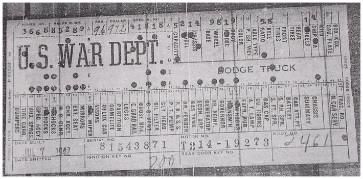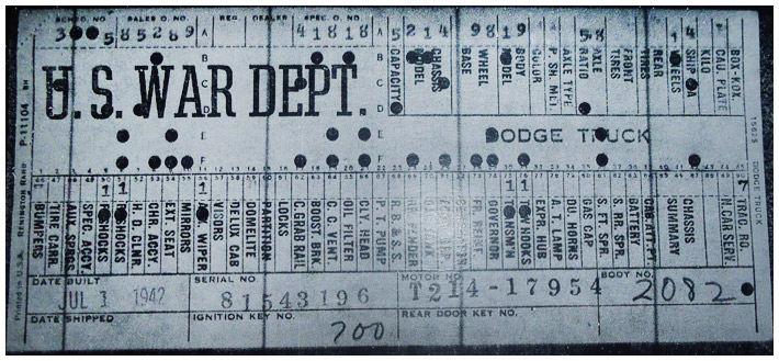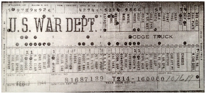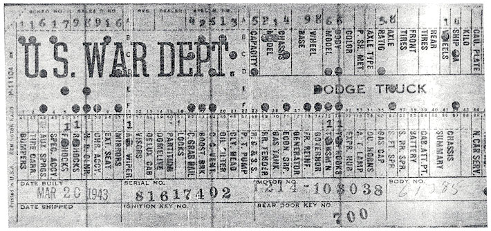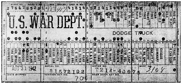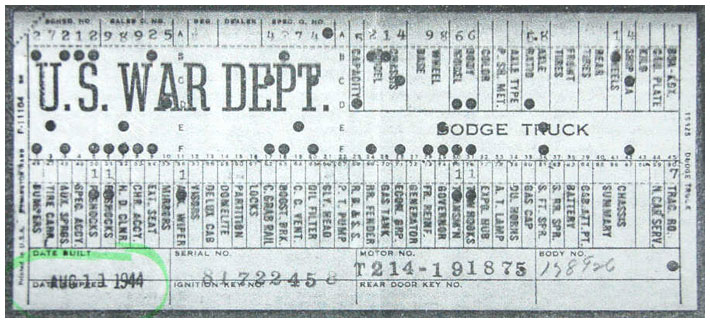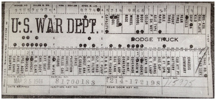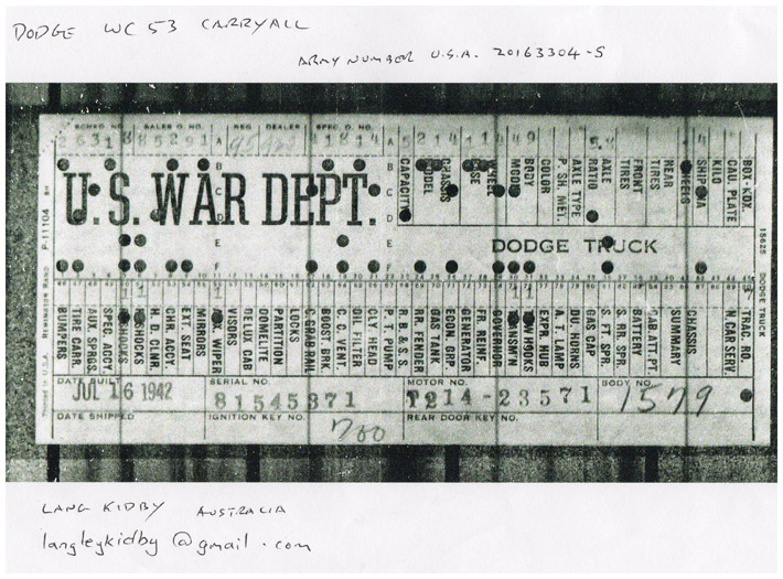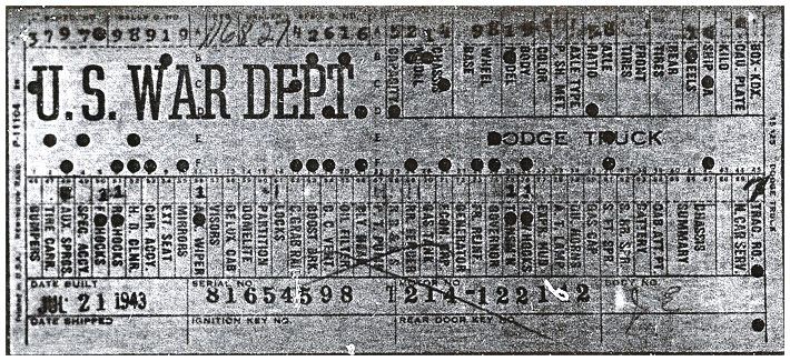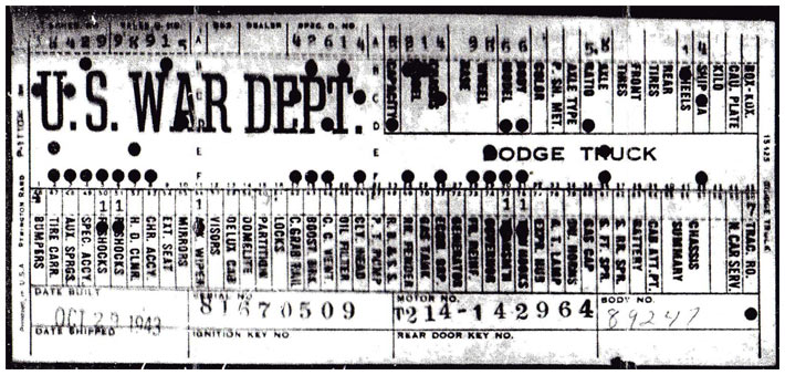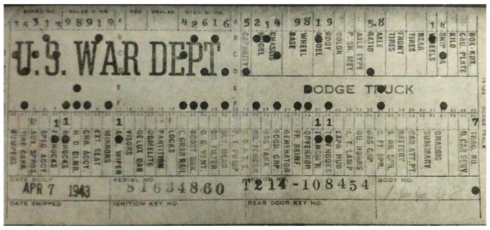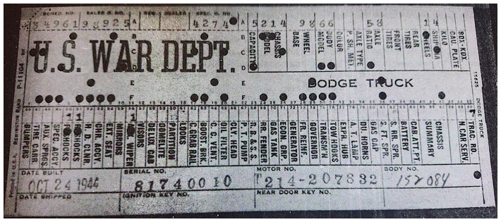The first picture shows a scan of a build card as received from the Chrysler archives. The card shows the original model and exact body of the Dodge with that serial / VIN number, here VIN 81546650 built with body 933 on 25th of July 1942 as a body model 29.