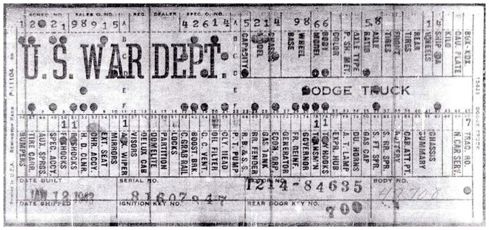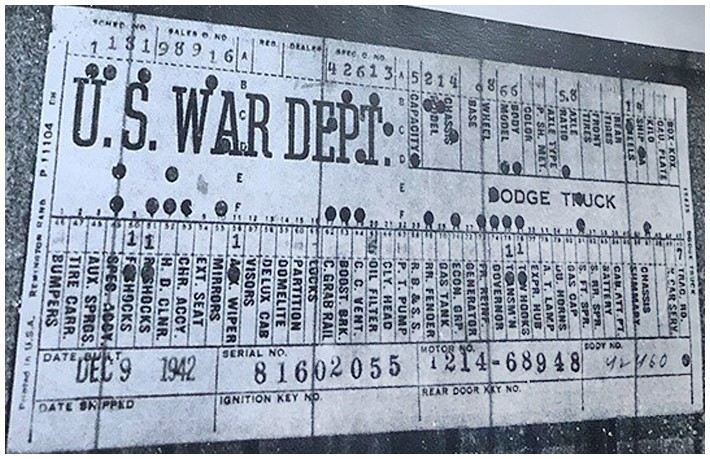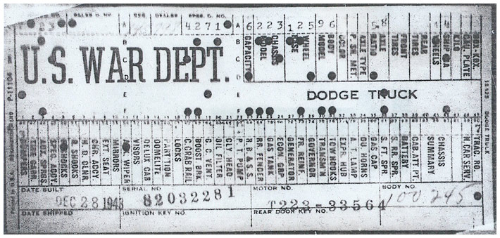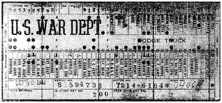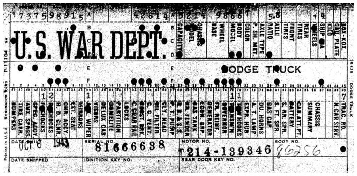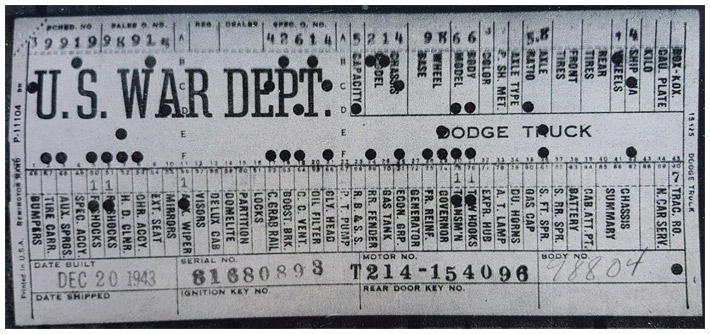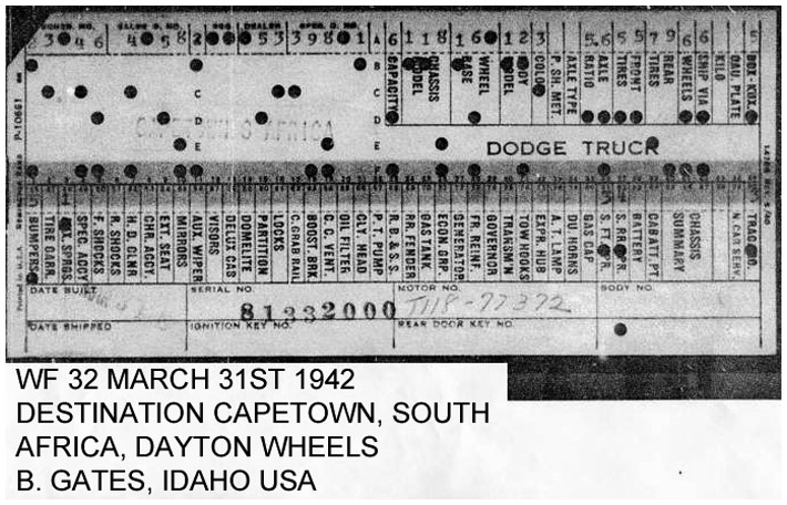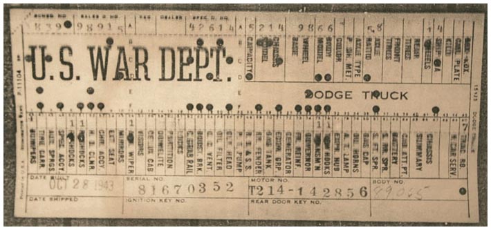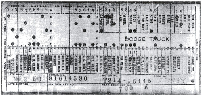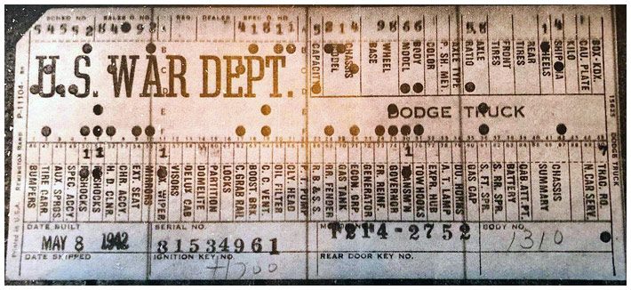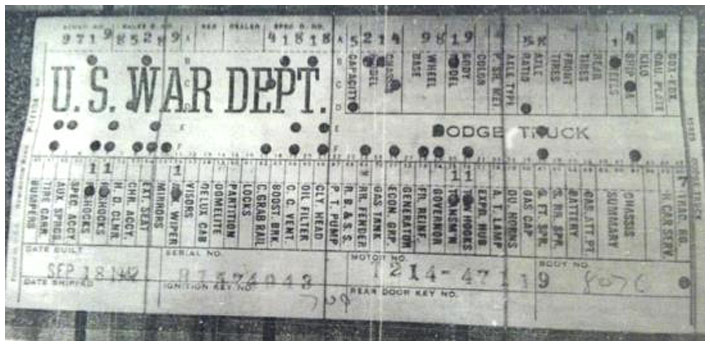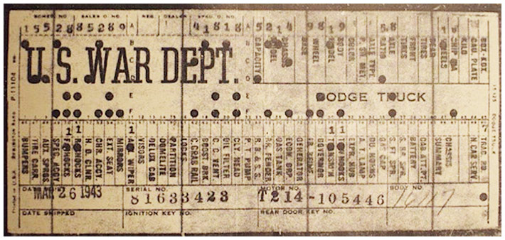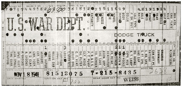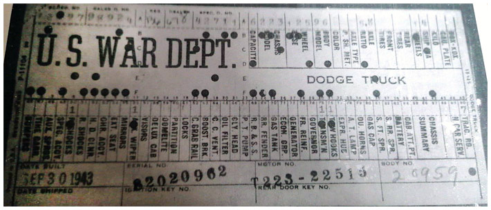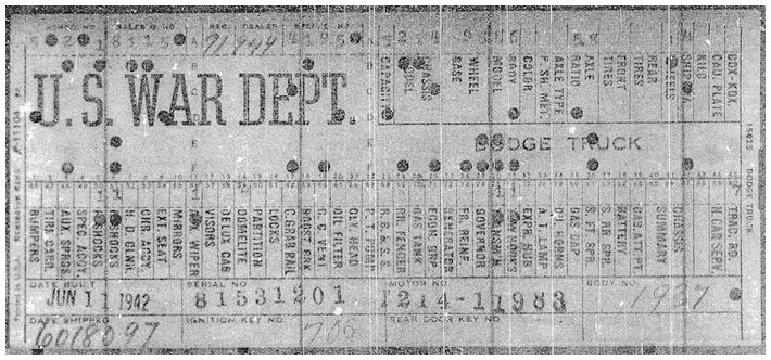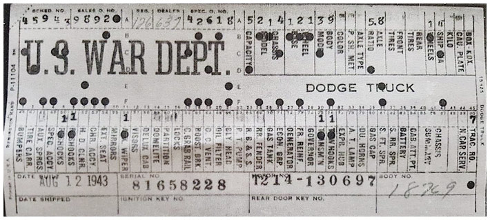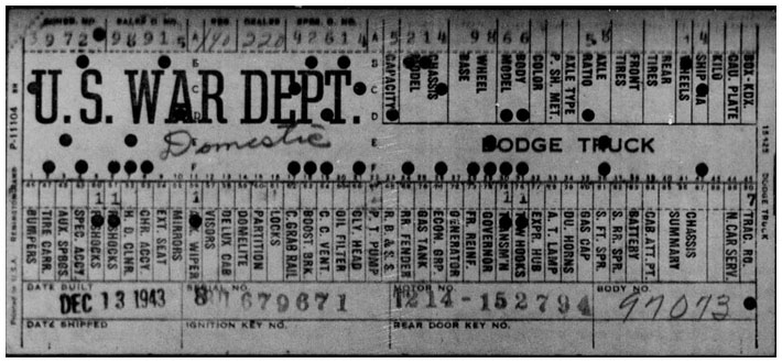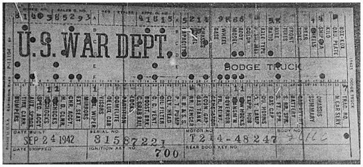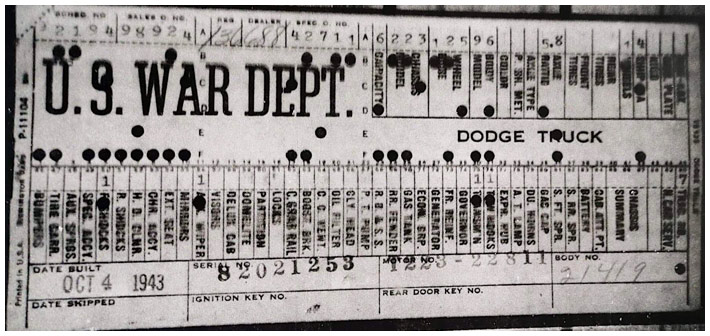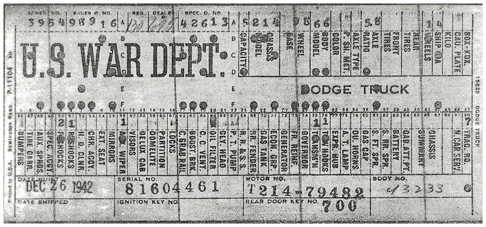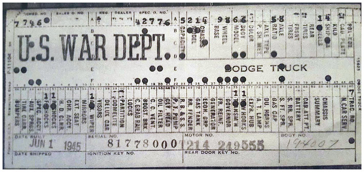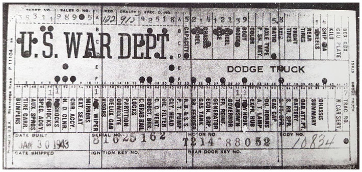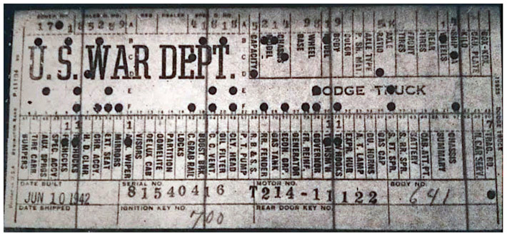 The first picture shows a scan of a build card as received from the Chrysler archives. The card shows the original model and exact body of the Dodge with that serial / VIN number, here VIN 81546650 built with body 933 on 25th of July 1942 as a body model 29.