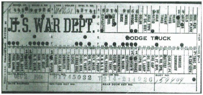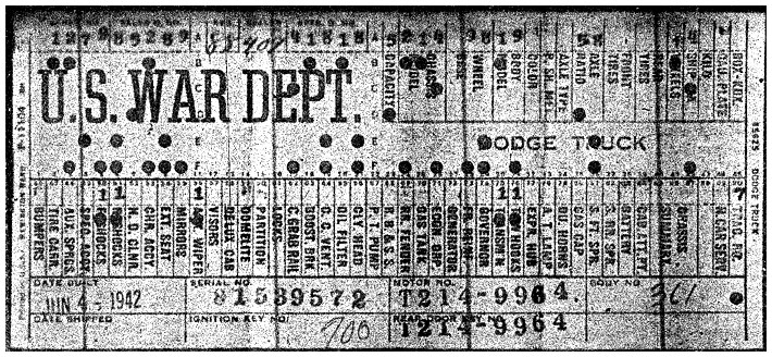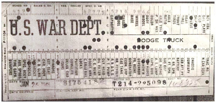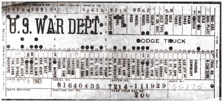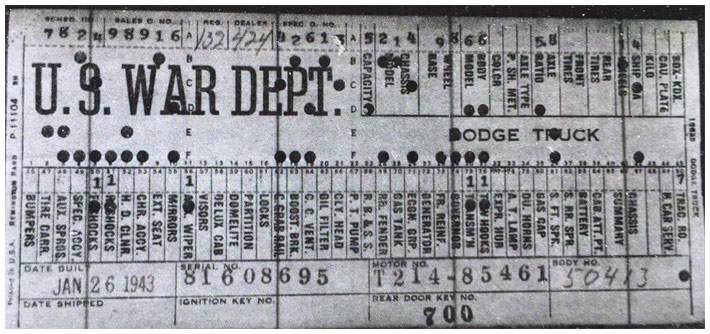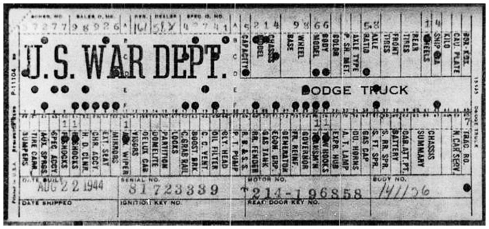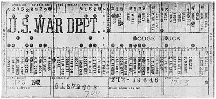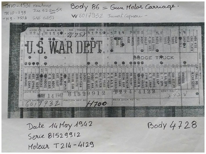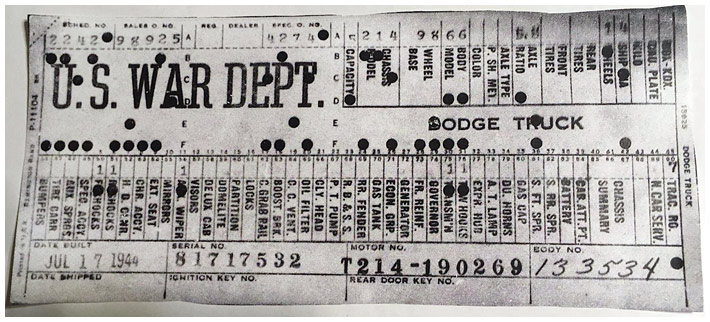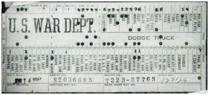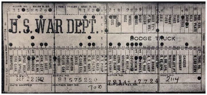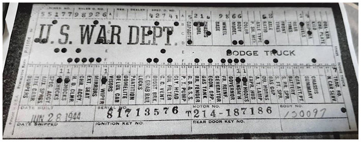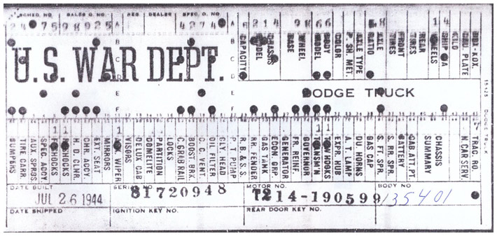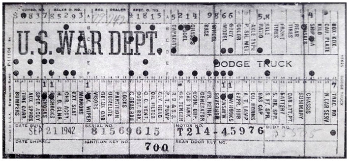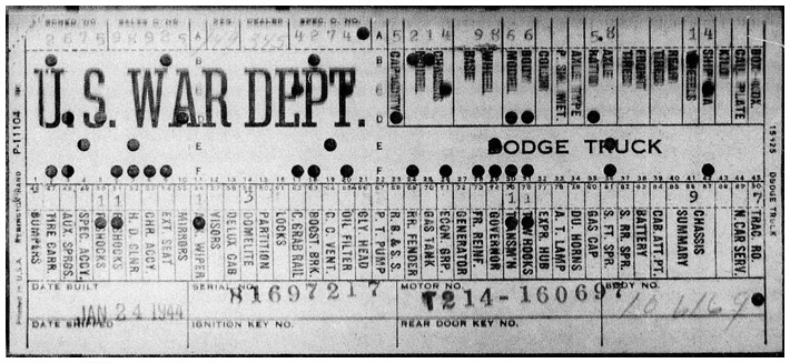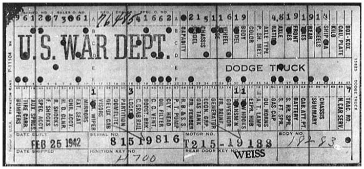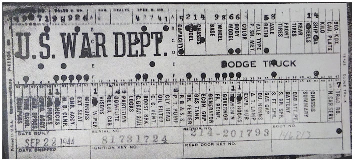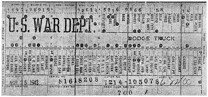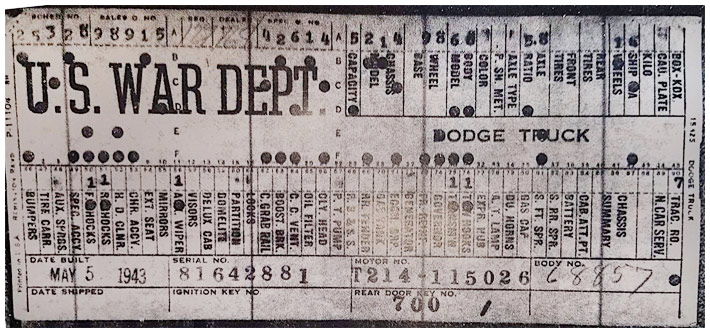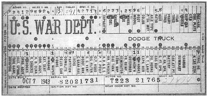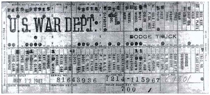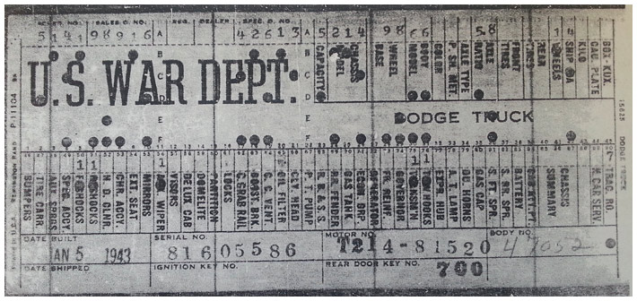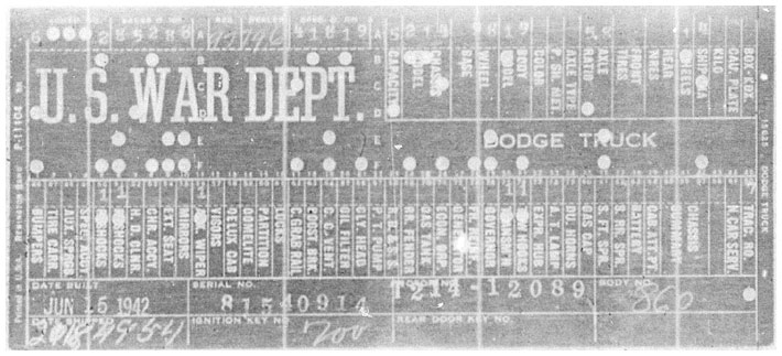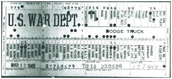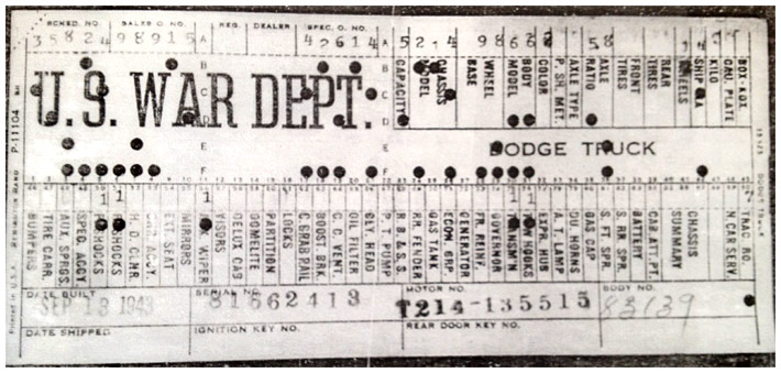 The first picture shows a scan of a build card as received from the Chrysler archives. The card shows the original model and exact body of the Dodge with that serial / VIN number, here VIN 81546650 built with body 933 on 25th of July 1942 as a body model 29.