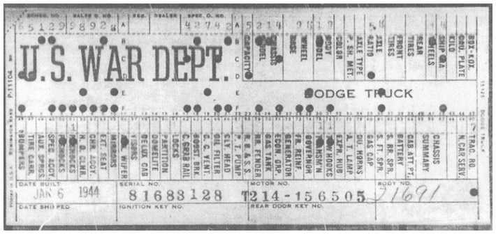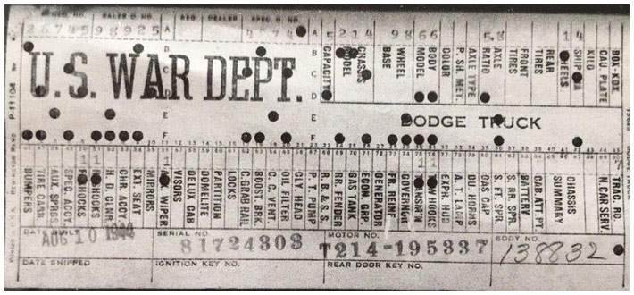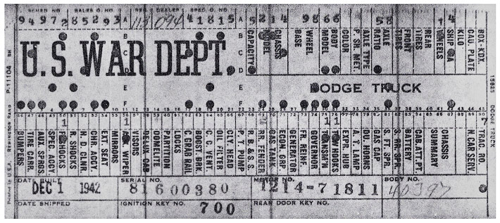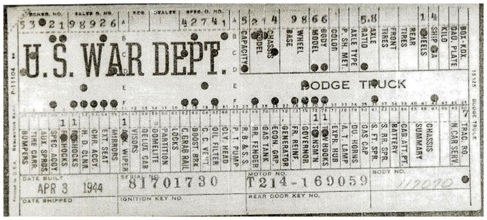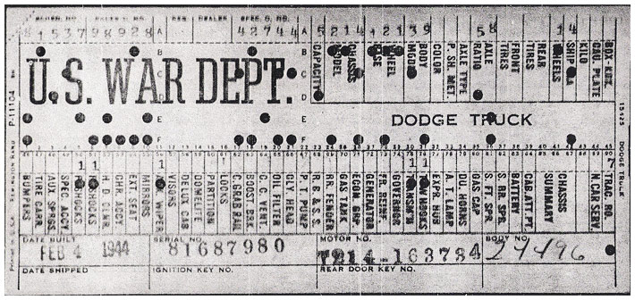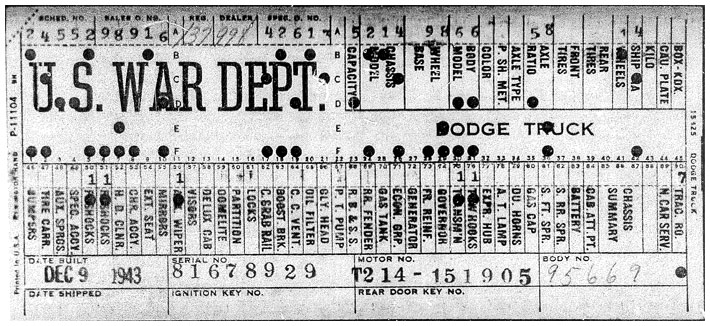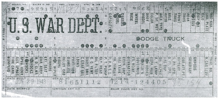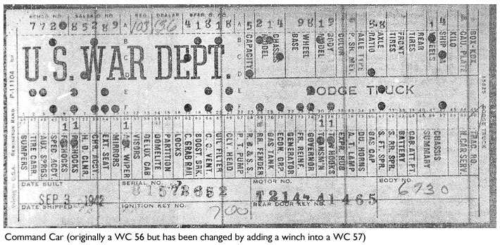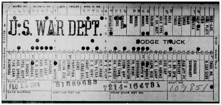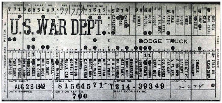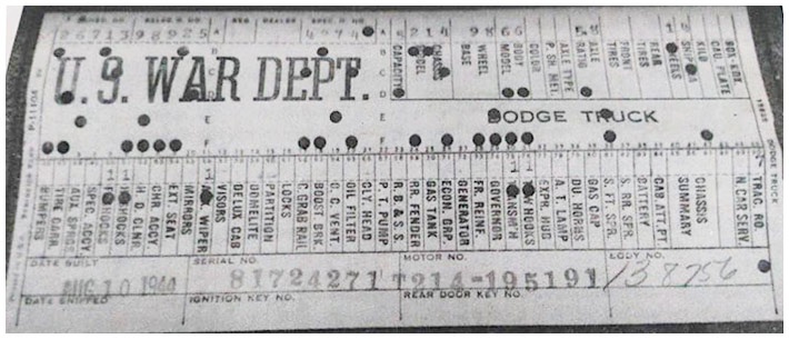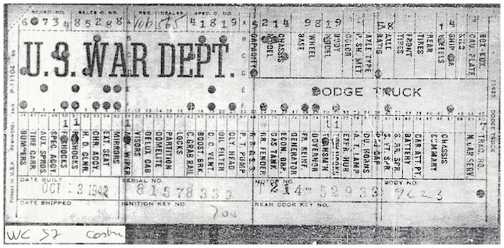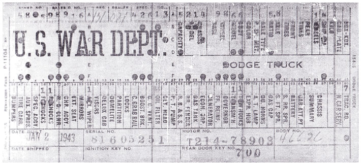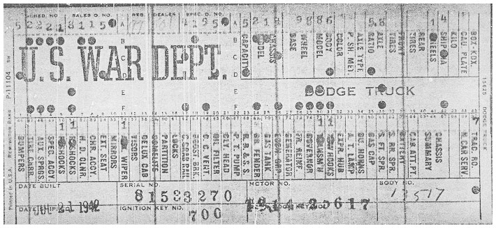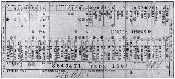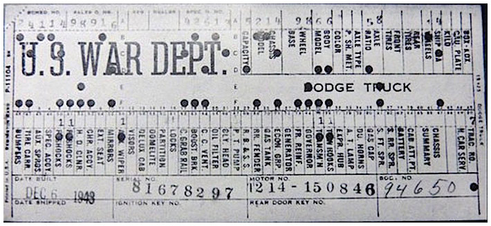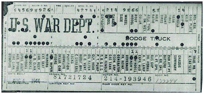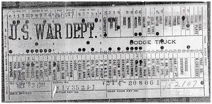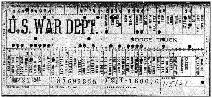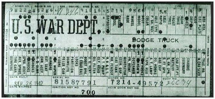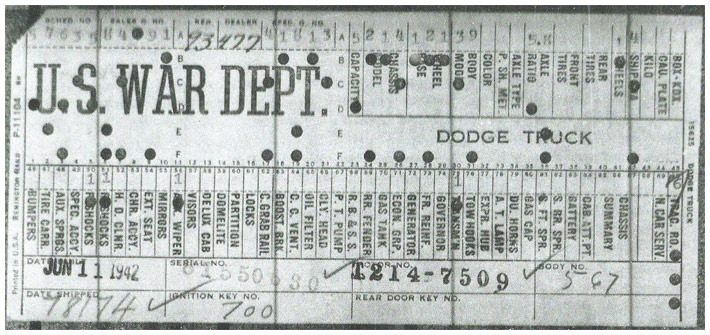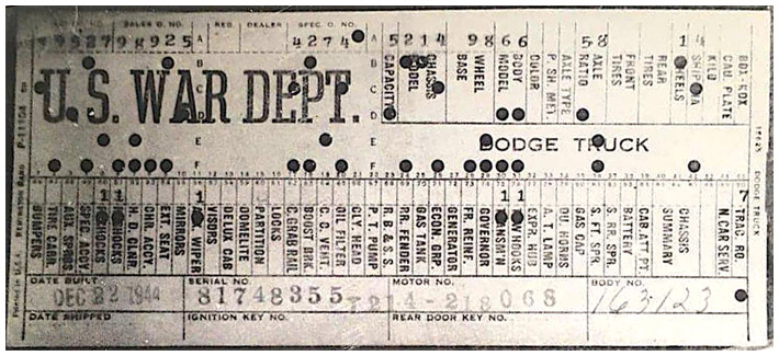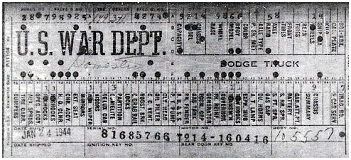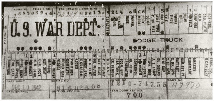 The first picture shows a scan of a build card as received from the Chrysler archives. The card shows the original model and exact body of the Dodge with that serial / VIN number, here VIN 81546650 built with body 933 on 25th of July 1942 as a body model 29.