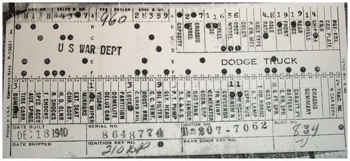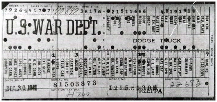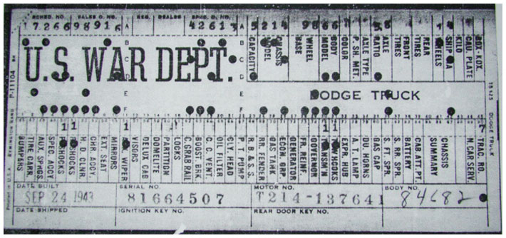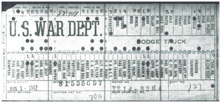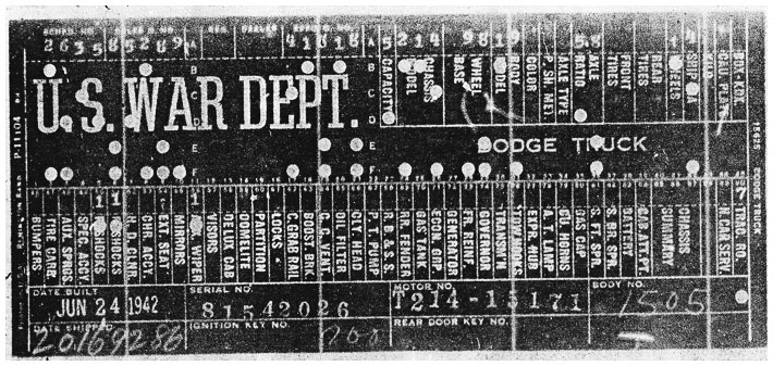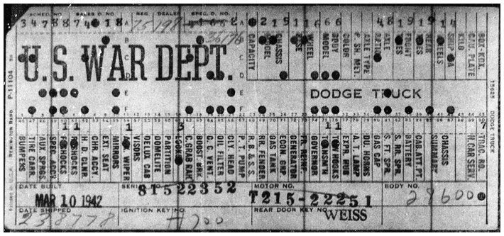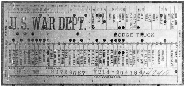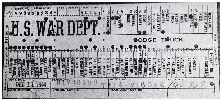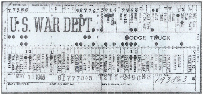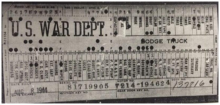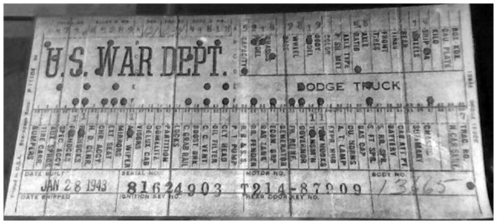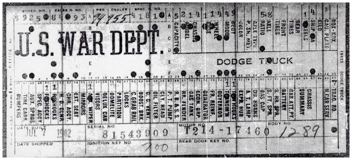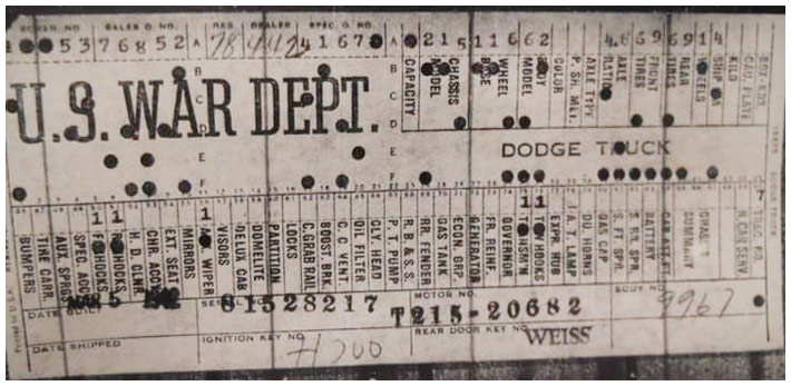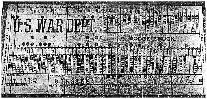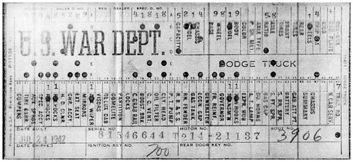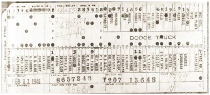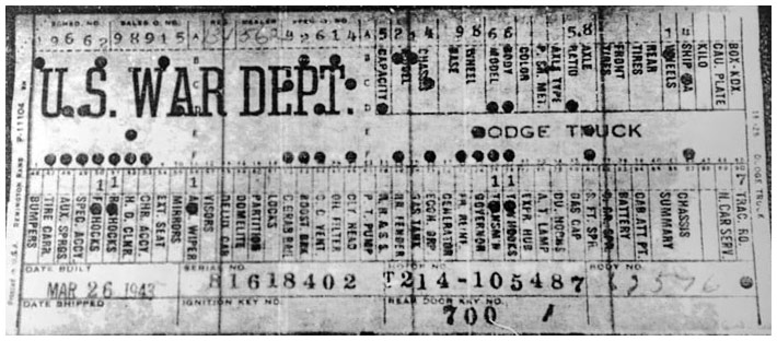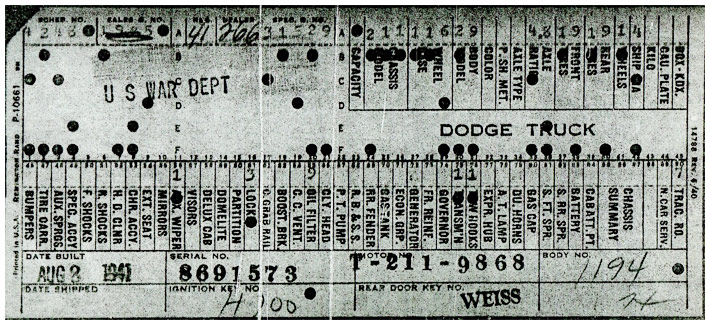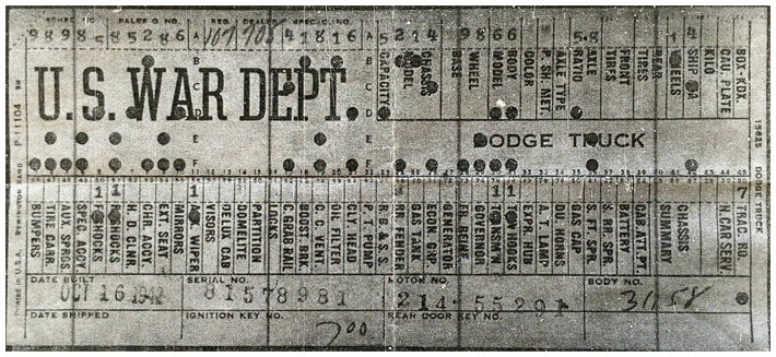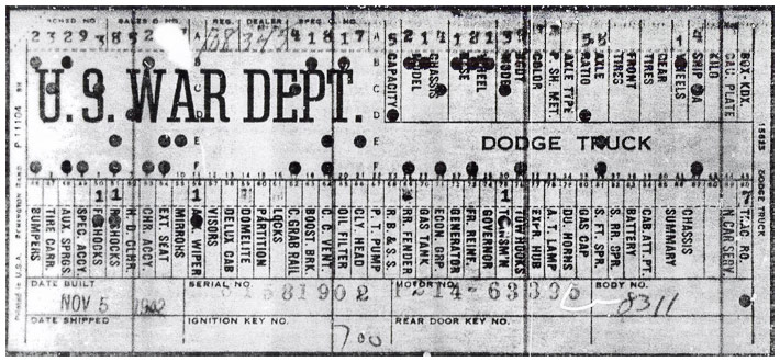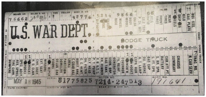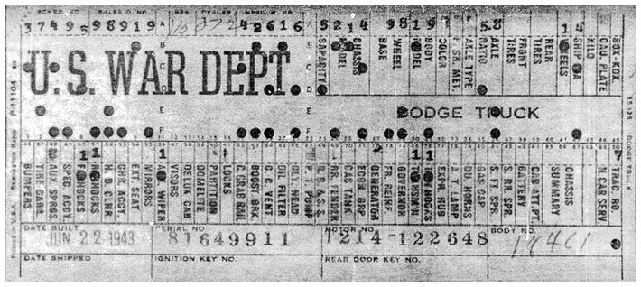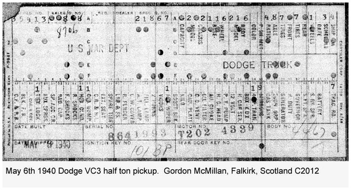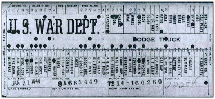 The first picture shows a scan of a build card as received from the Chrysler archives. The card shows the original model and exact body of the Dodge with that serial / VIN number, here VIN 81546650 built with body 933 on 25th of July 1942 as a body model 29.