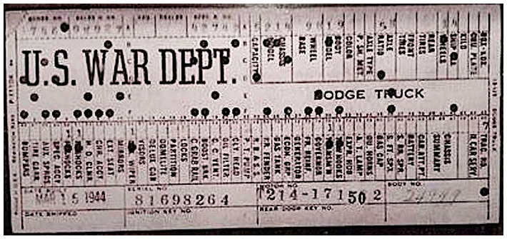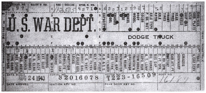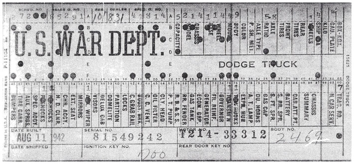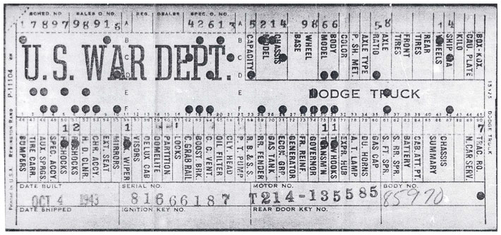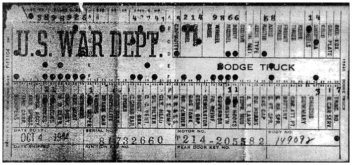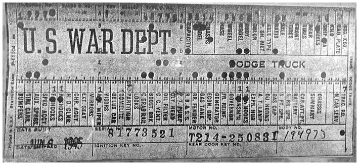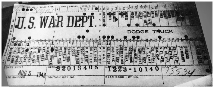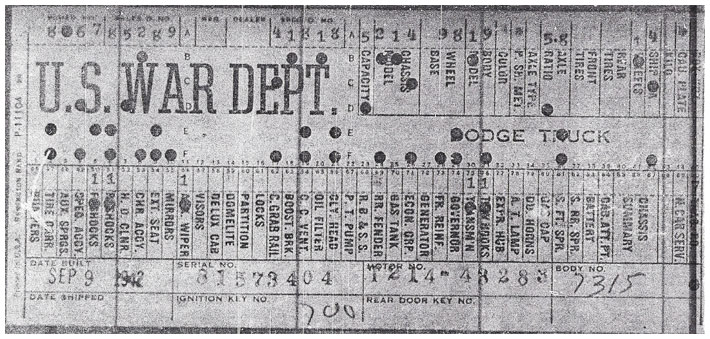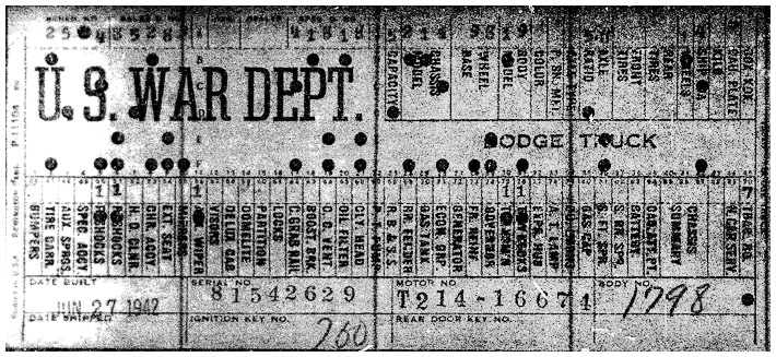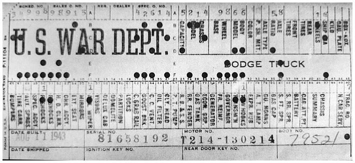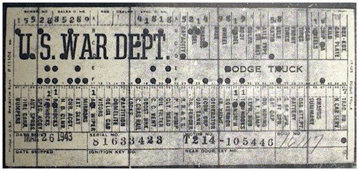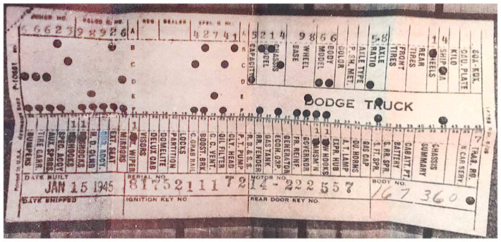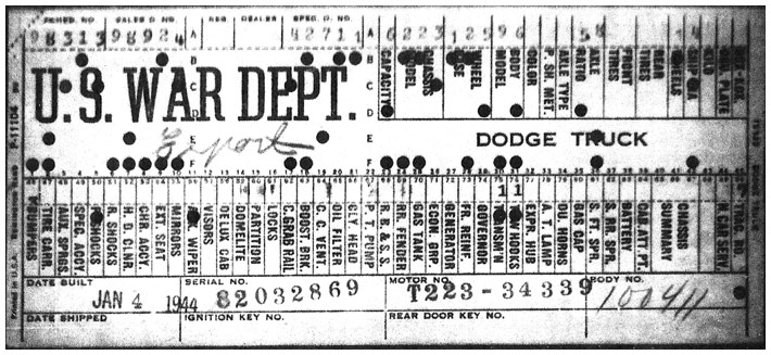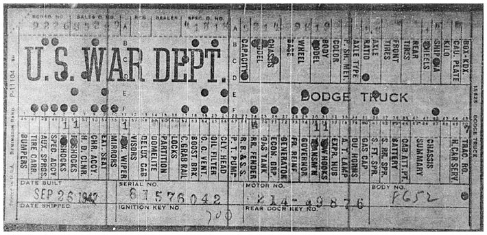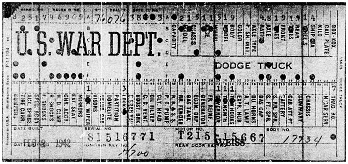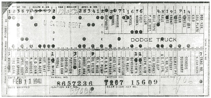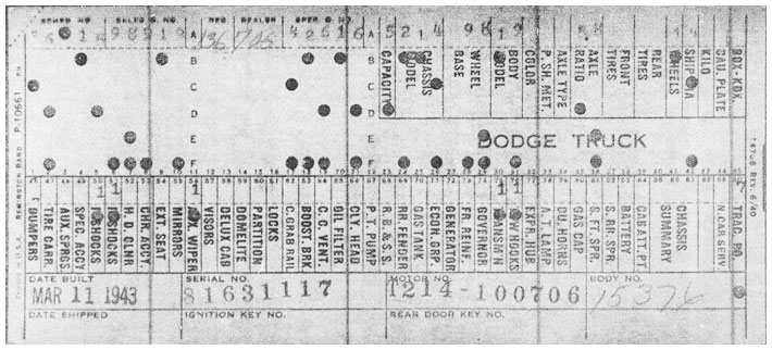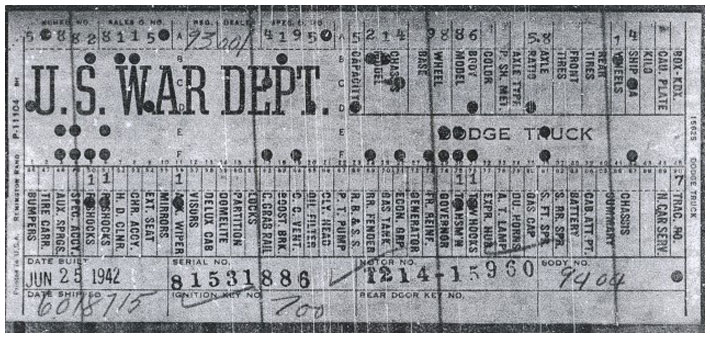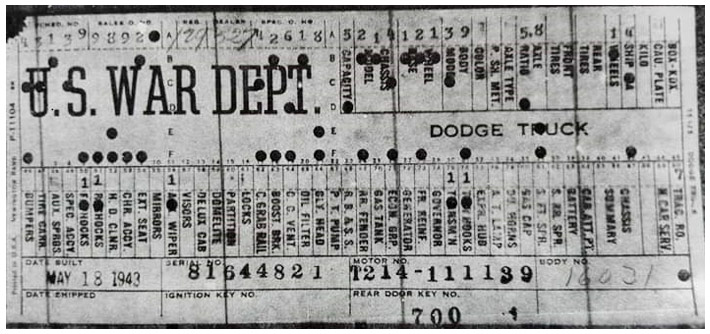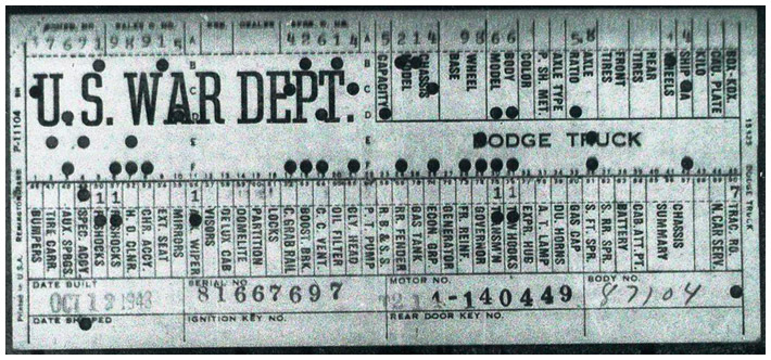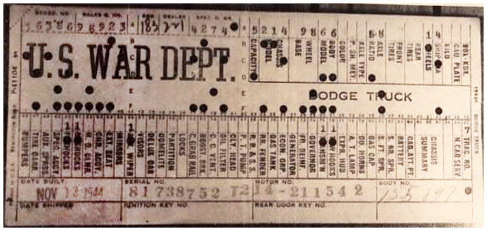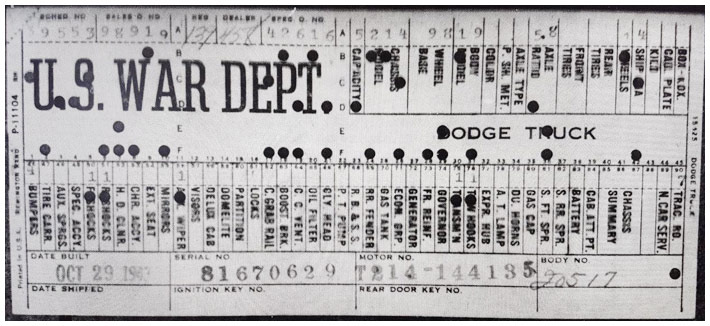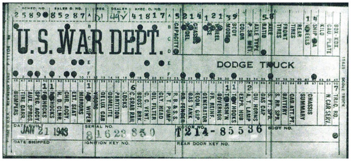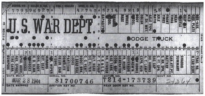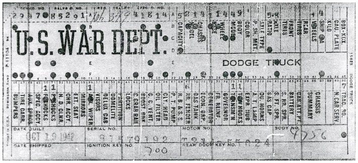 The first picture shows a scan of a build card as received from the Chrysler archives. The card shows the original model and exact body of the Dodge with that serial / VIN number, here VIN 81546650 built with body 933 on 25th of July 1942 as a body model 29.