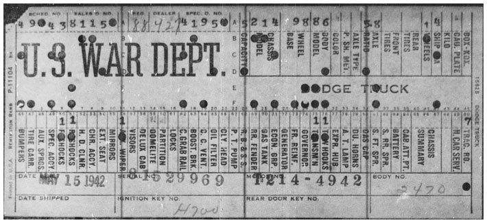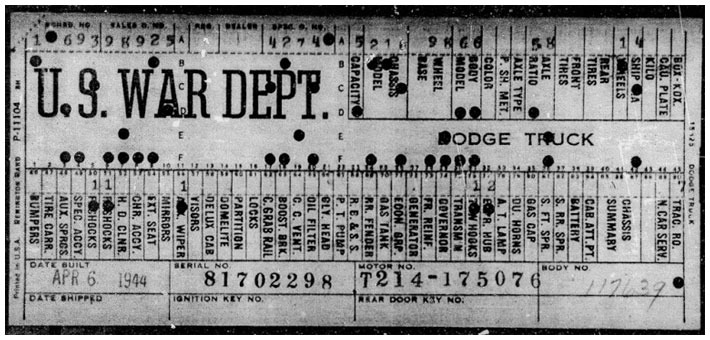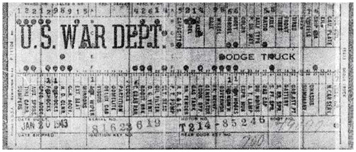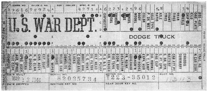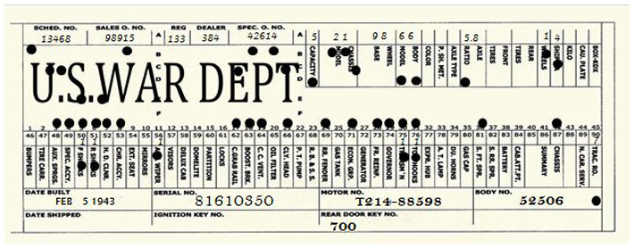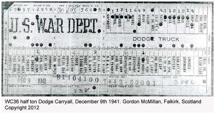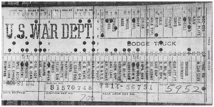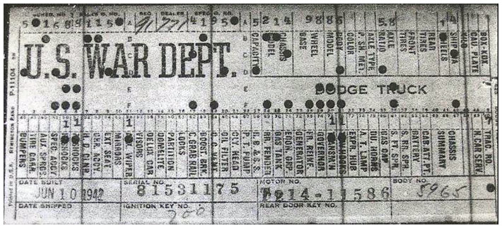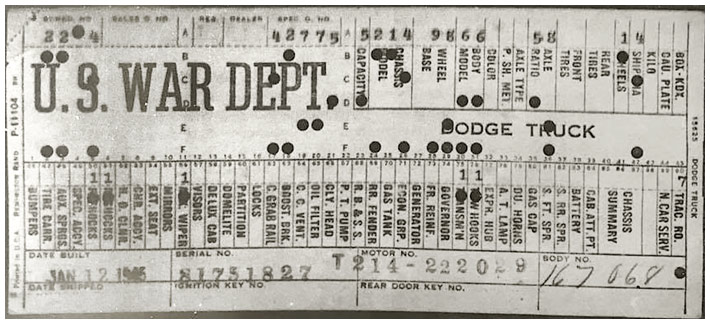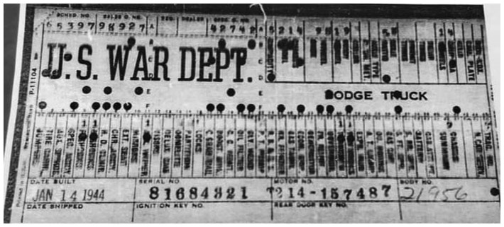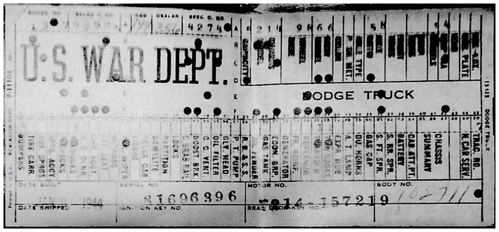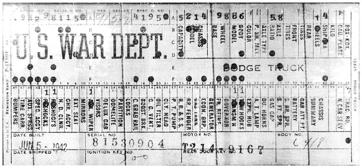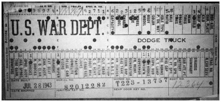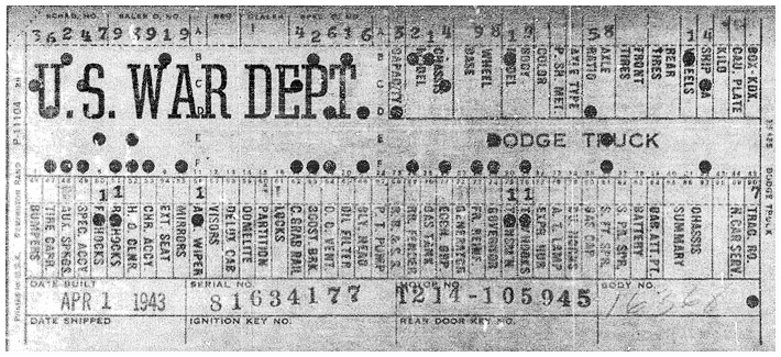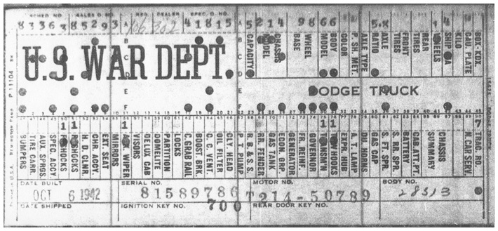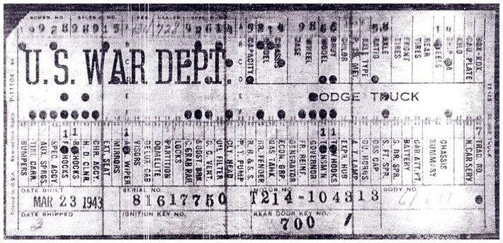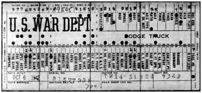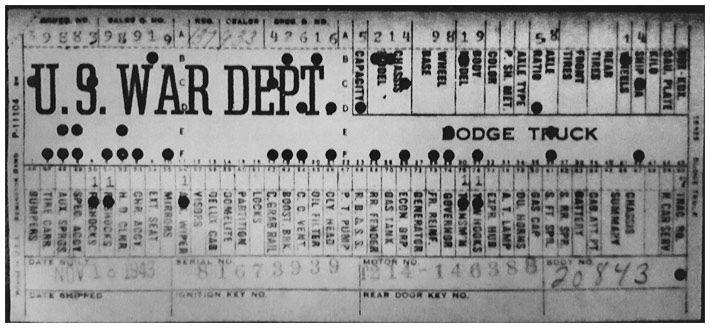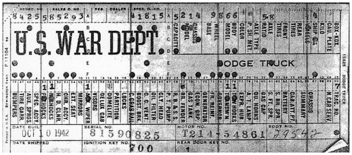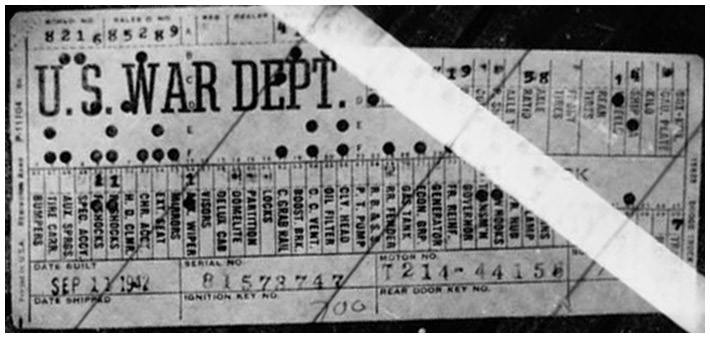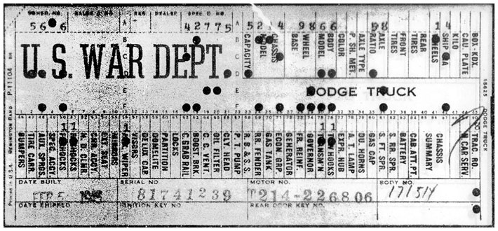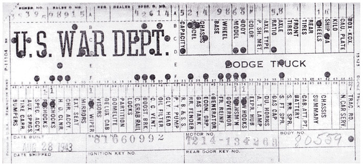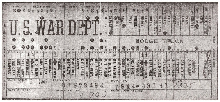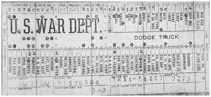 The first picture shows a scan of a build card as received from the Chrysler archives. The card shows the original model and exact body of the Dodge with that serial / VIN number, here VIN 81546650 built with body 933 on 25th of July 1942 as a body model 29.