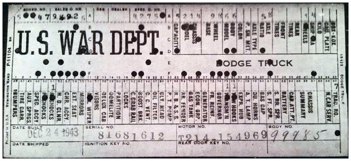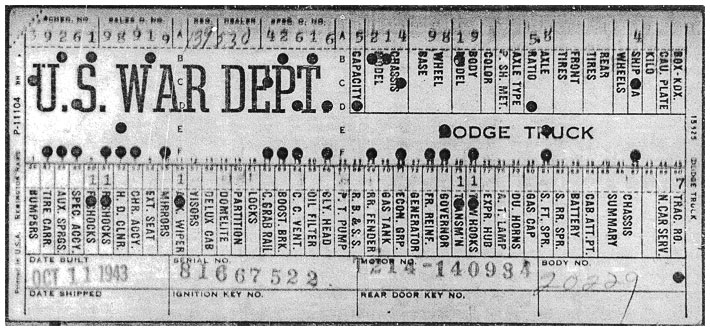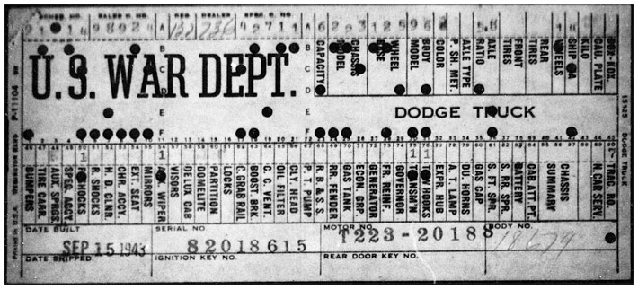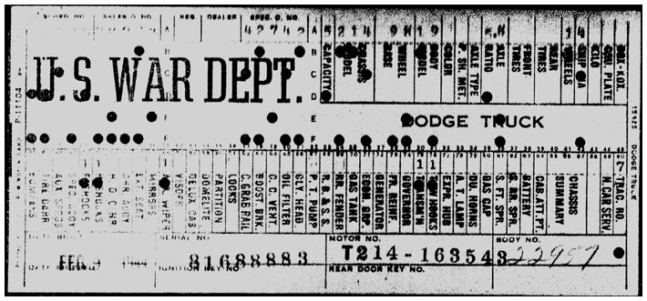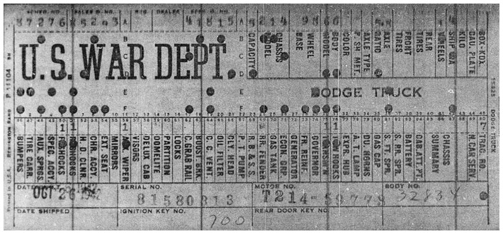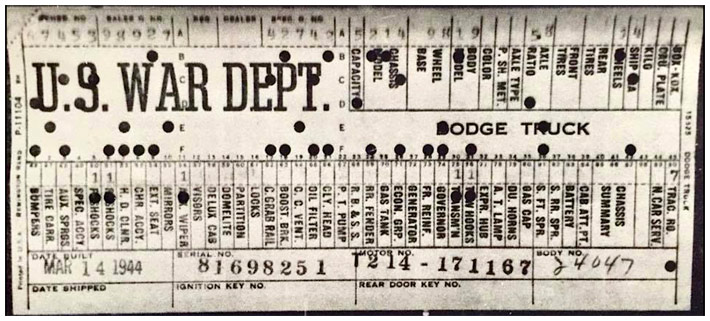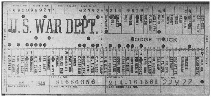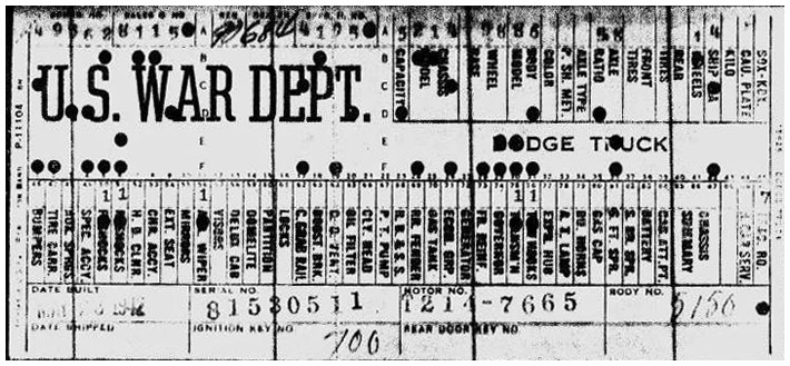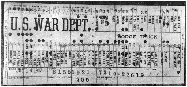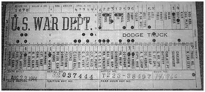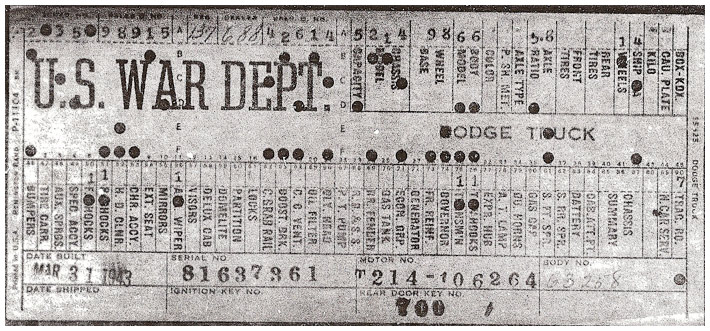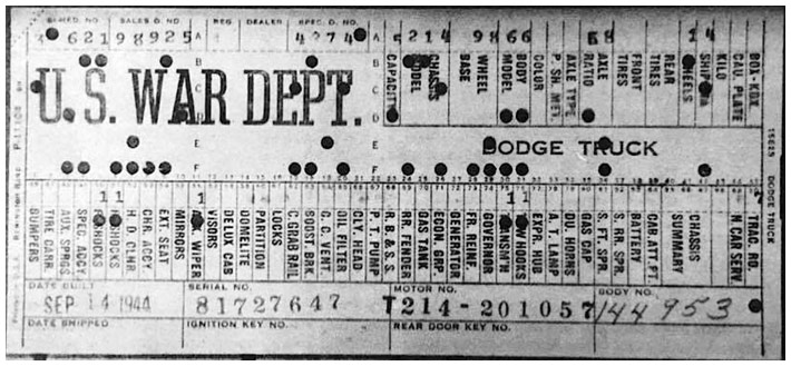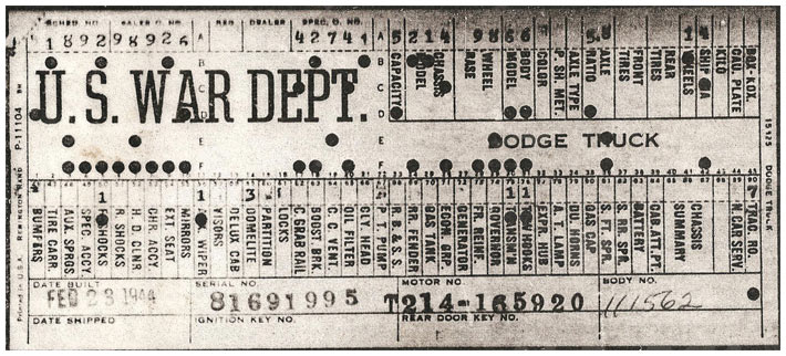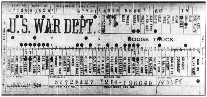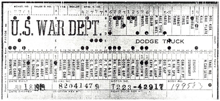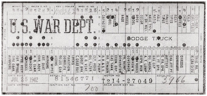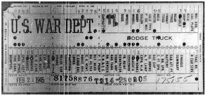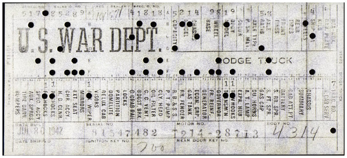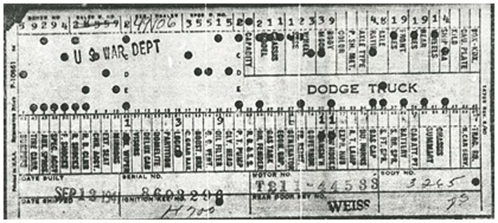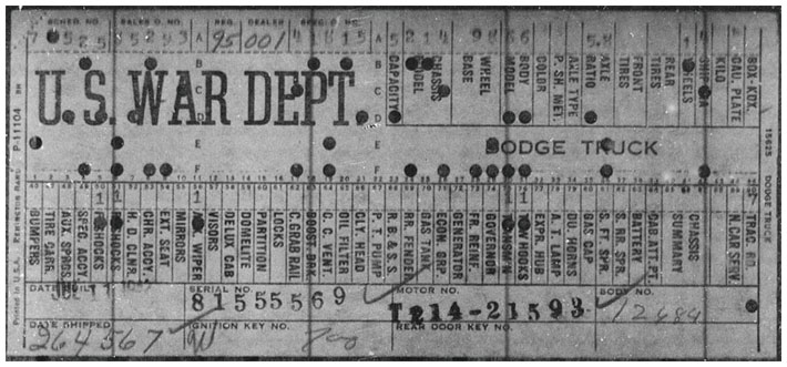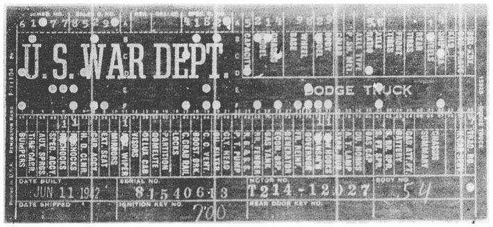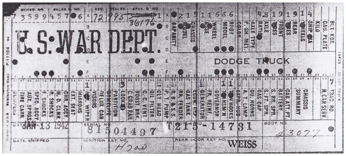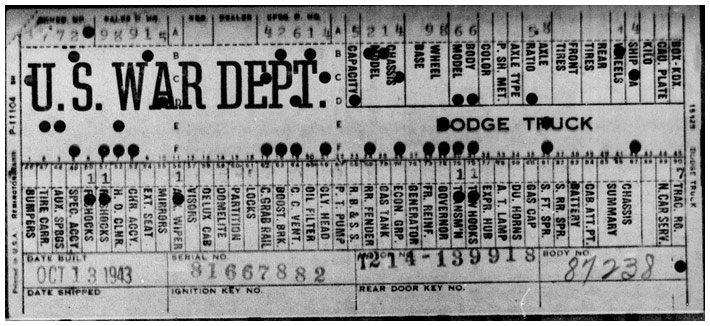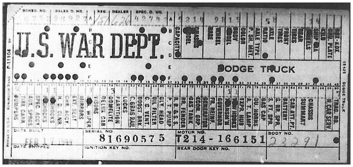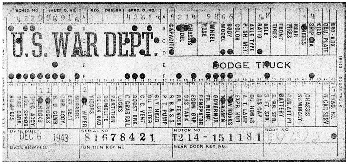 The first picture shows a scan of a build card as received from the Chrysler archives. The card shows the original model and exact body of the Dodge with that serial / VIN number, here VIN 81546650 built with body 933 on 25th of July 1942 as a body model 29.