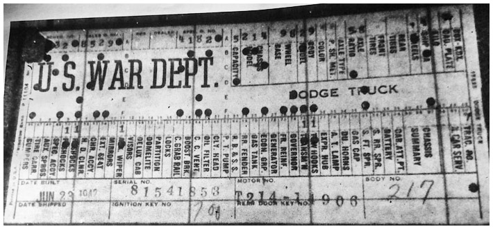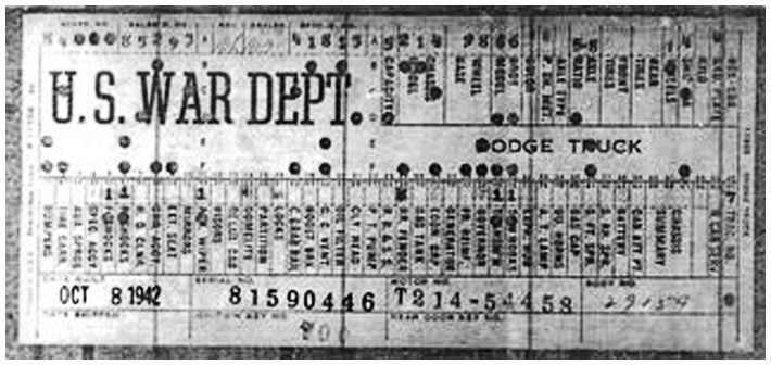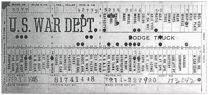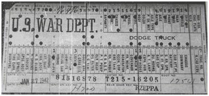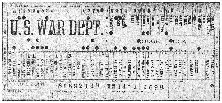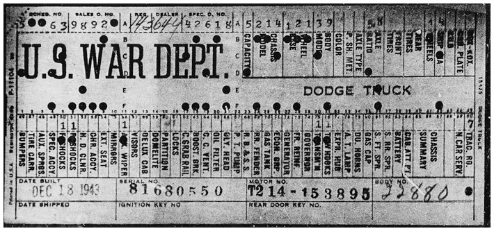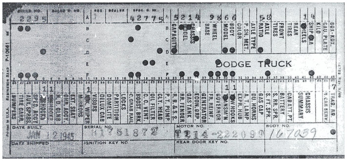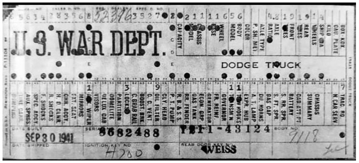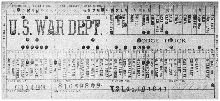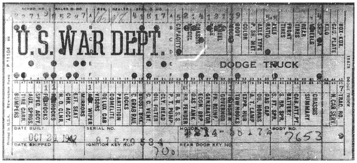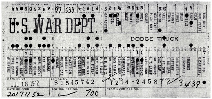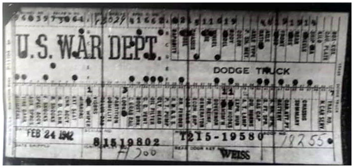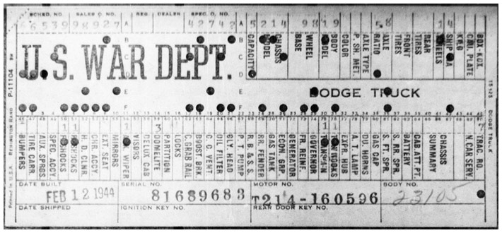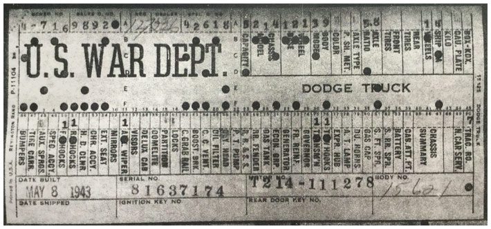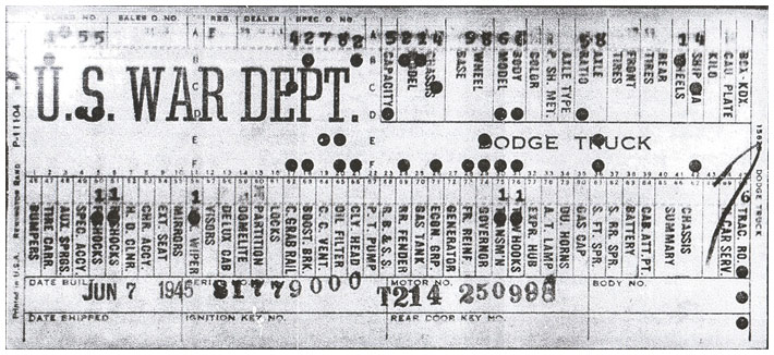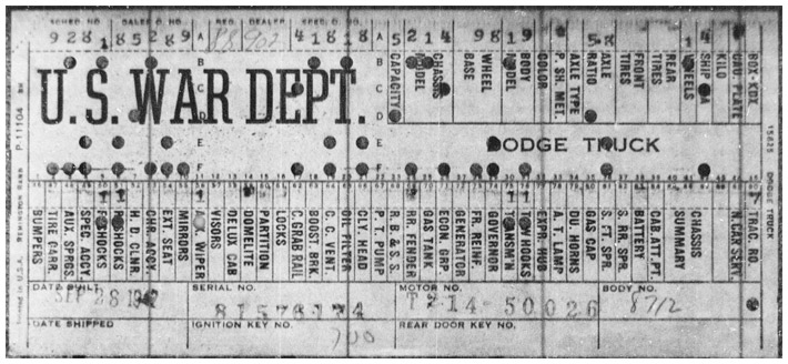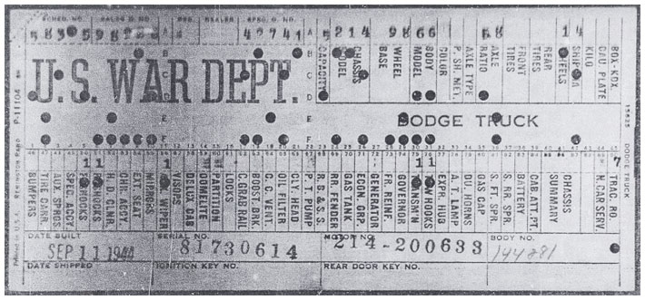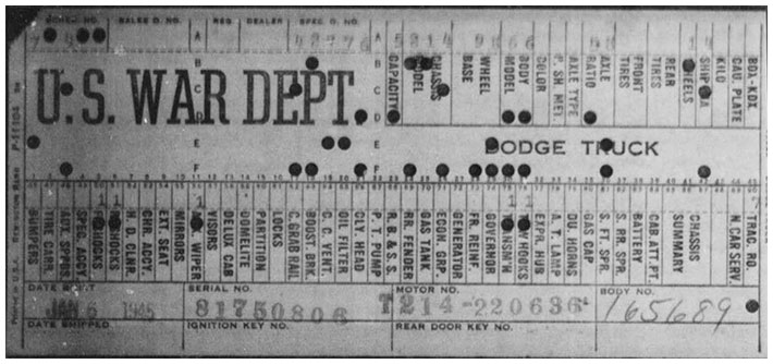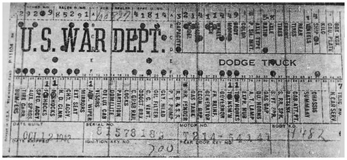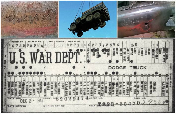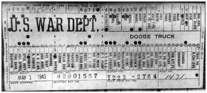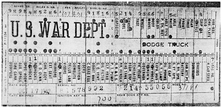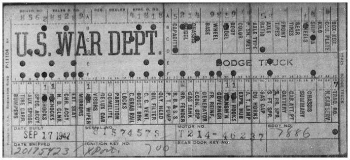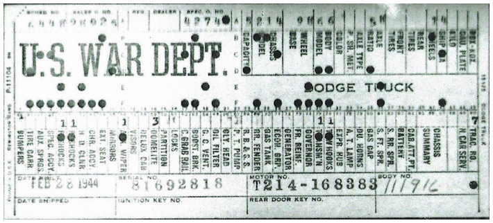 The first picture shows a scan of a build card as received from the Chrysler archives. The card shows the original model and exact body of the Dodge with that serial / VIN number, here VIN 81546650 built with body 933 on 25th of July 1942 as a body model 29.